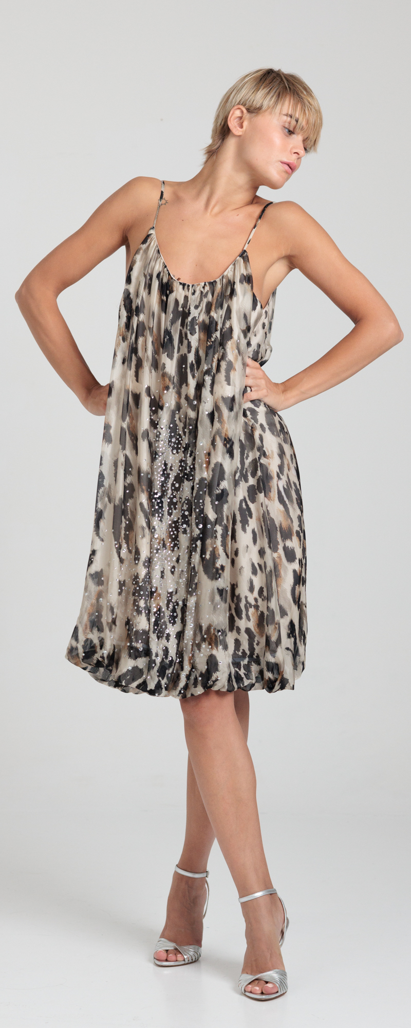 Tessuto chiffon seta e viscosa stampa leopardata color sabbia, beige, ciccolato e nero. Applicazione di strass in cristallo in degrade, di varie dimensioni, color crystal sulla parte davanti.