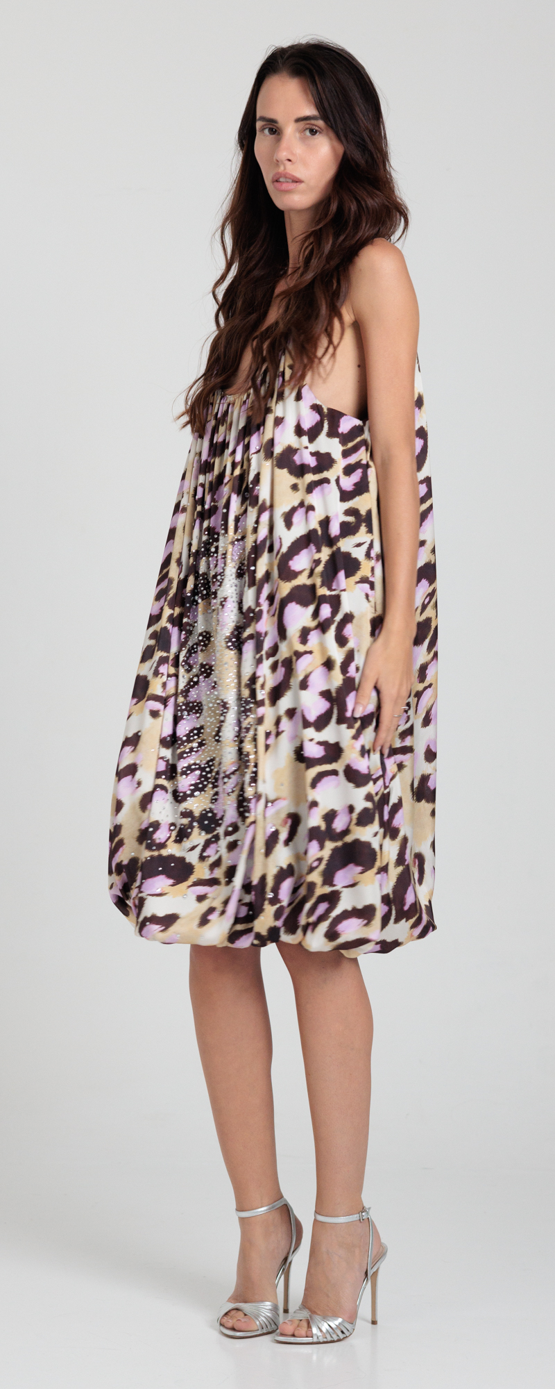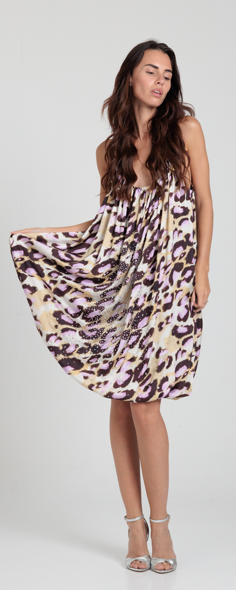 Satin stampa leopardata color champagne, sabbia, rosa e cioccolato. Applicazione di strass in cristallo in degrade, di varie dimensioni, color crystal sulla parte davanti.