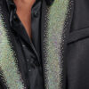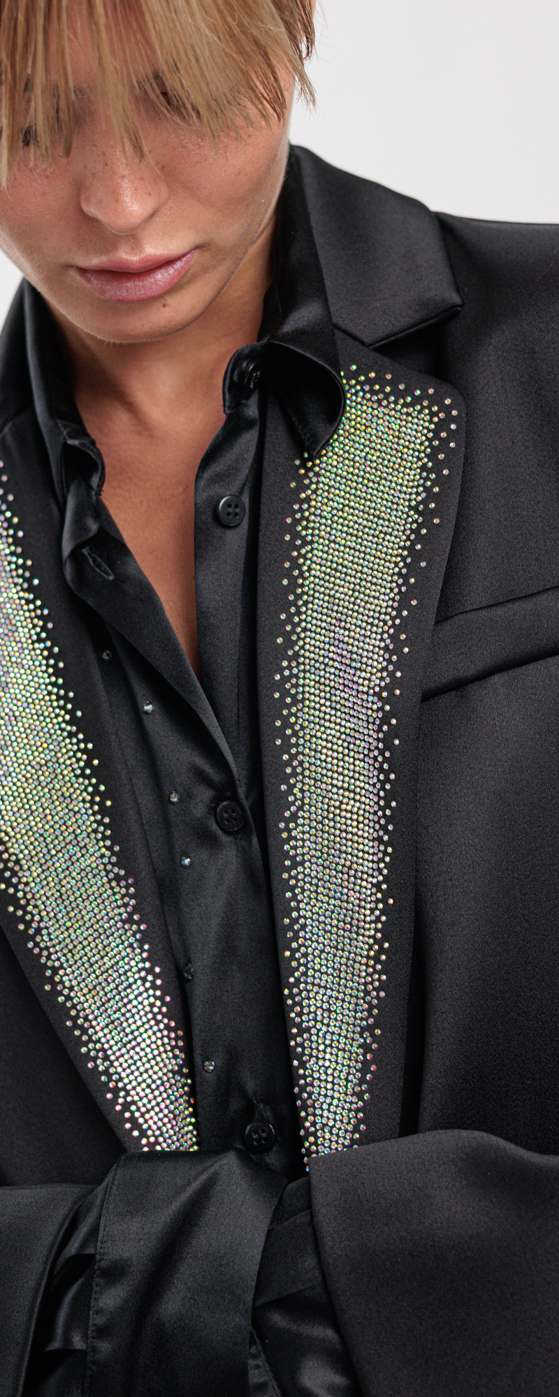Tessuto nero lucido. Applicazione di strass in cristallo color opal sul revere.