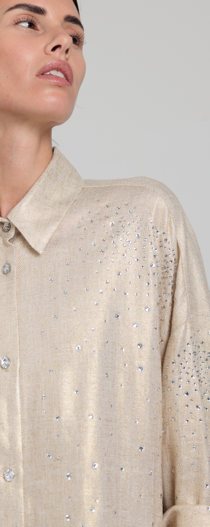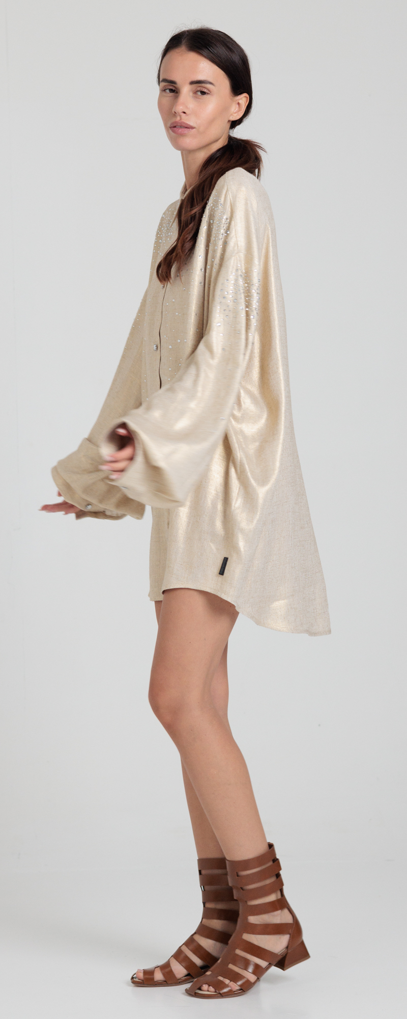 CAMICIA MINI ABITO SABBIA CHIARO CON PLACCATURA ORO E STRASS CHEMISIER 20S26