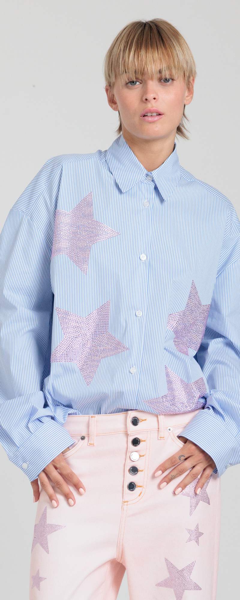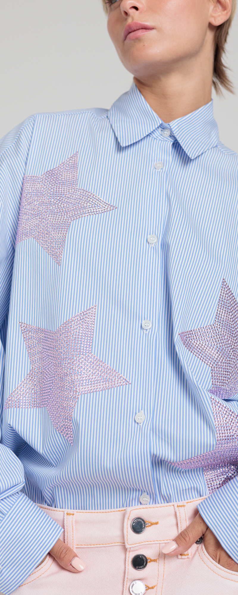 Popeline di cotone, bastoncino color azzurro e bianco. Applicazione stelle macro di strass in cristallo color light rose.