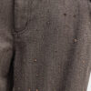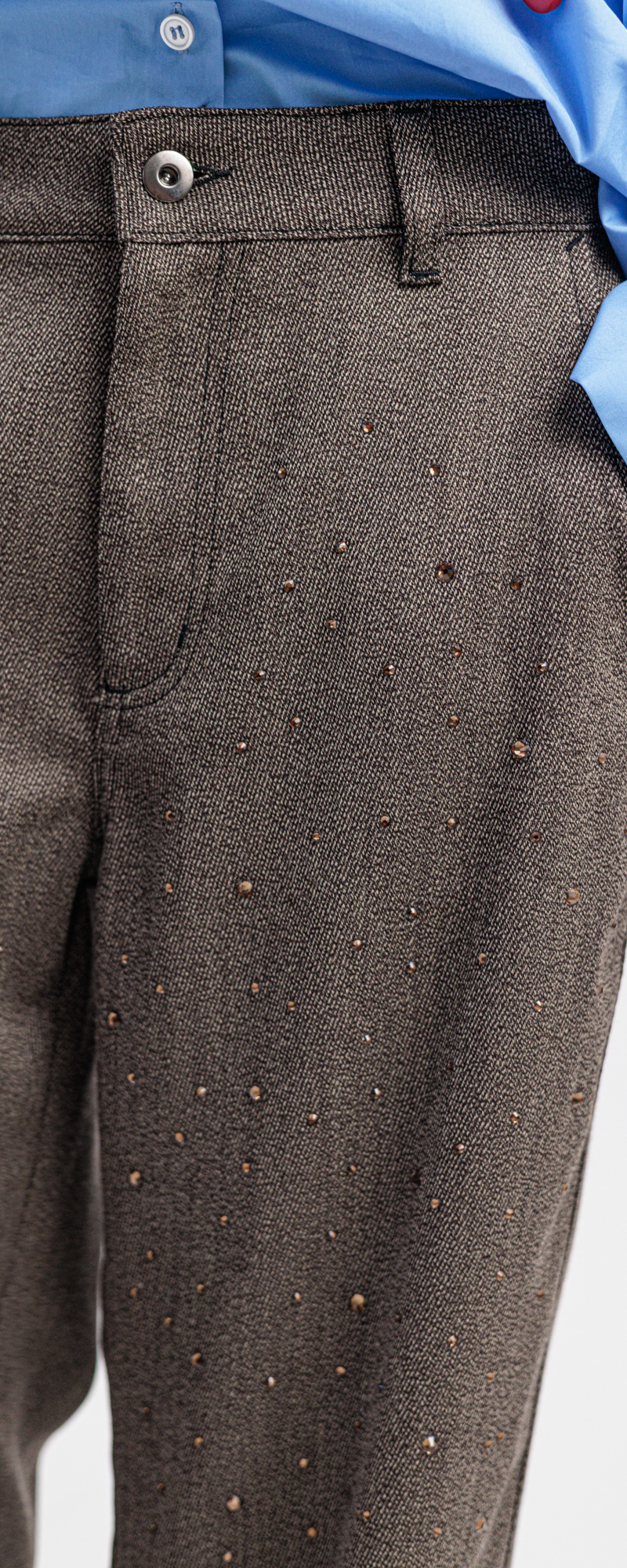 Tessuto sale e pepe nei toni del marrone e del beige. Applicazione di strass in cristallo color smoked topaz.