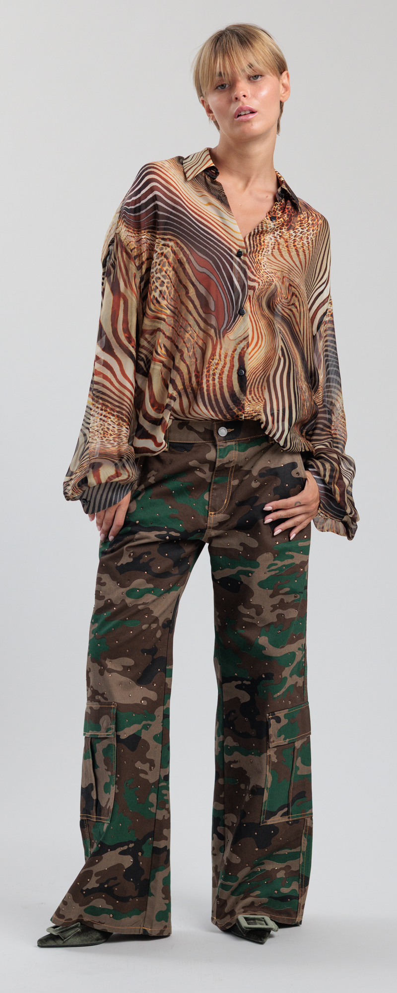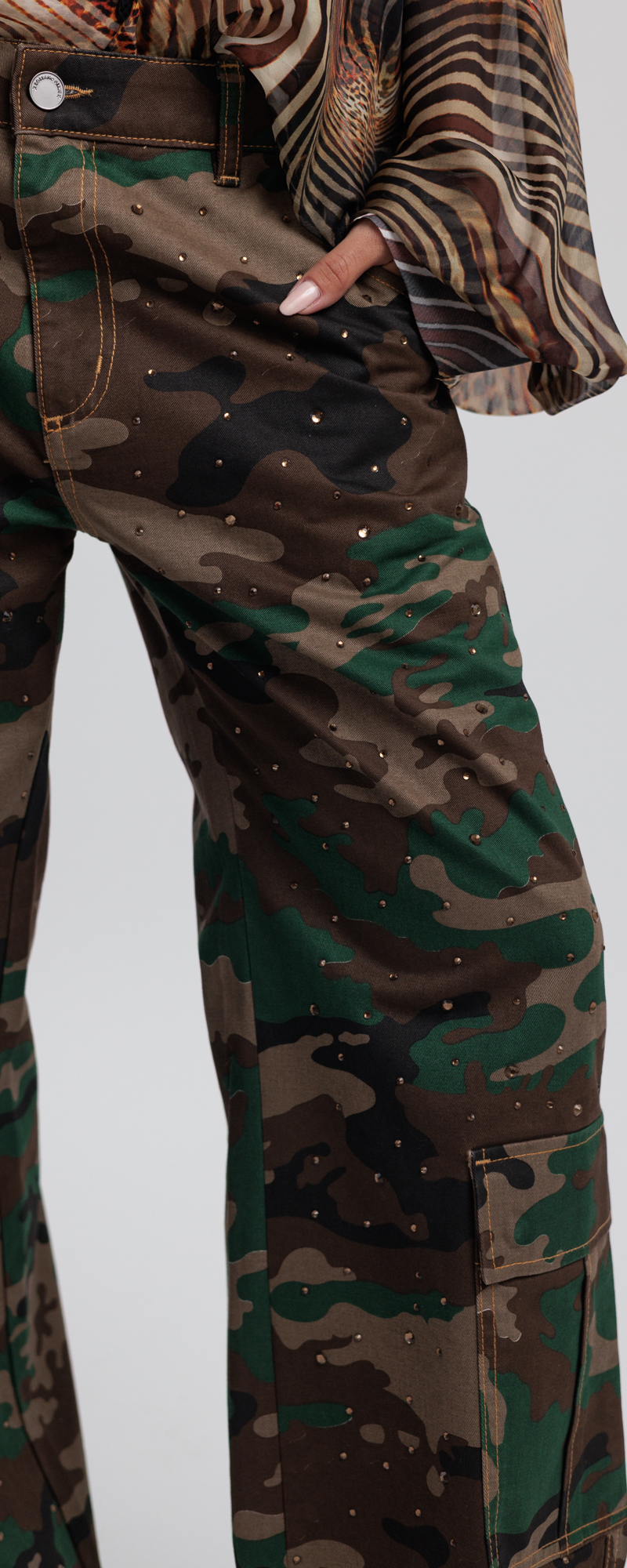 Drill di cotone stampa mimetica, verde, fanco, marrone, nero. Applicazione all over sul davanti di strass in cristallo color smocked topaz.