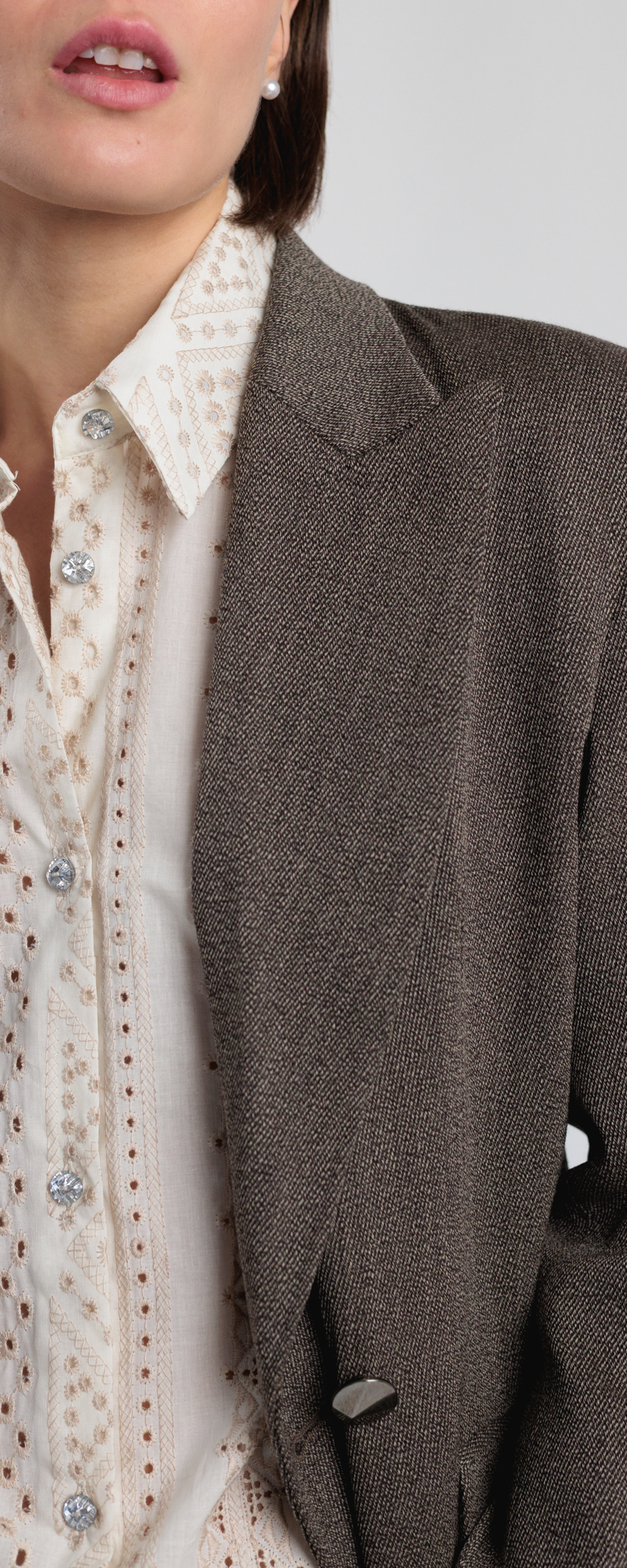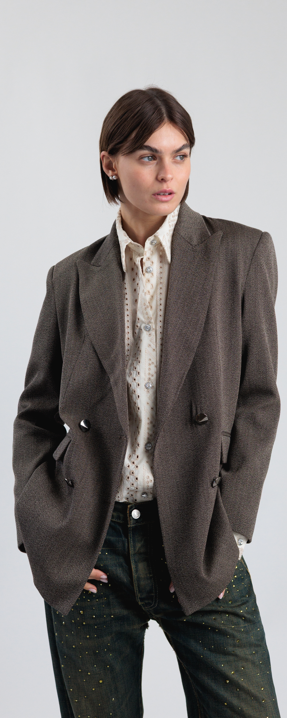 Blazer doppio petto con chiusura 4 bottoni gioiello a forma piramidale, color canna di fucile. Revere a lancia e tasche a patta in vita sul davanti. Maniche lunghe con 3 bottoni ai polsi. Foderata in raso. Vestibilità standard taglio dritto. Spalline interne imbottite.