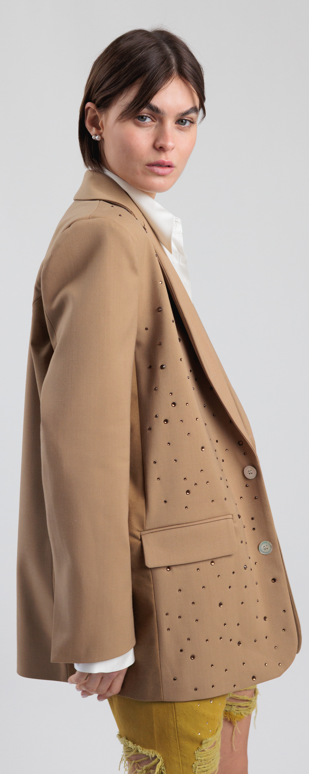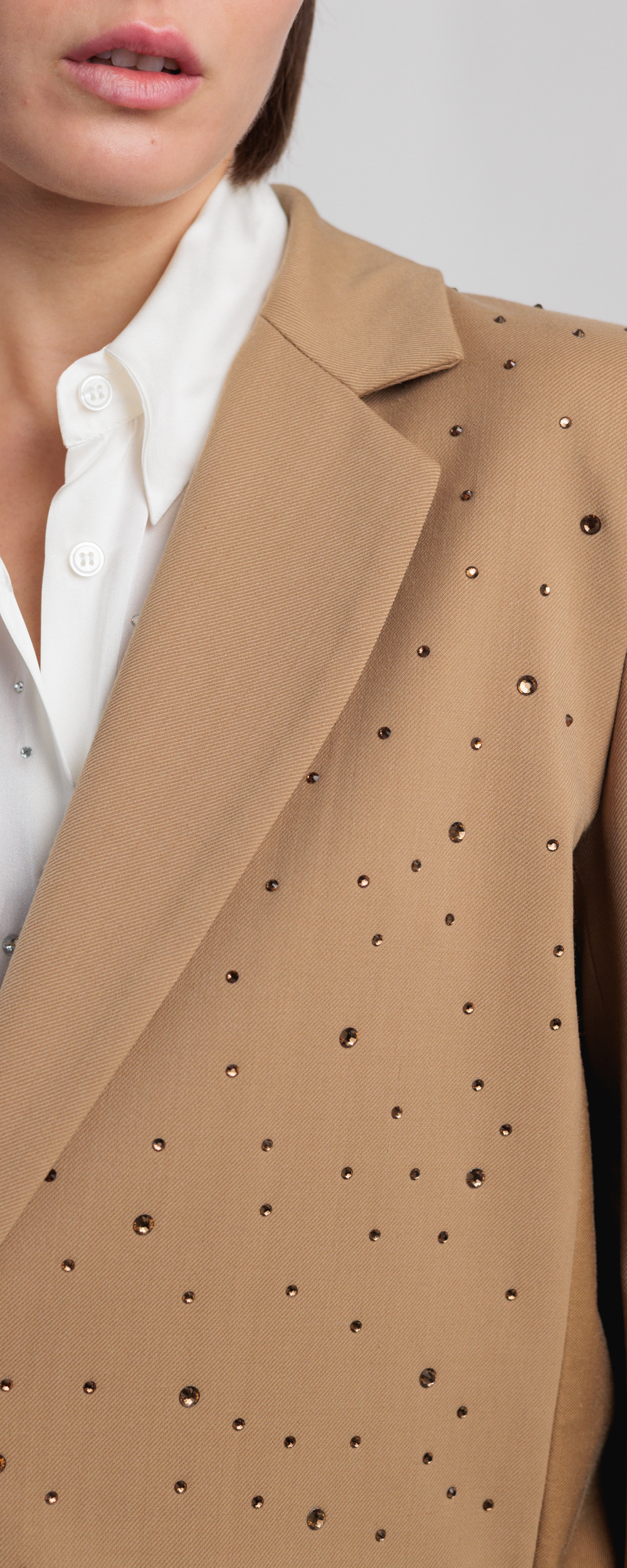 Tessuto di cotone color cammello. Applicazione di strass all over sul davanti color cioccolato.