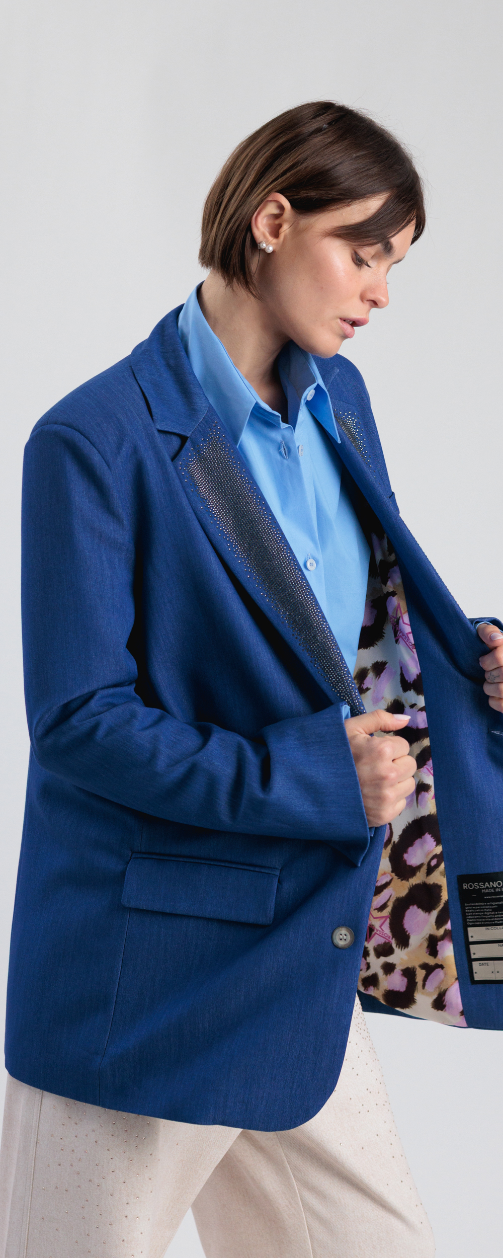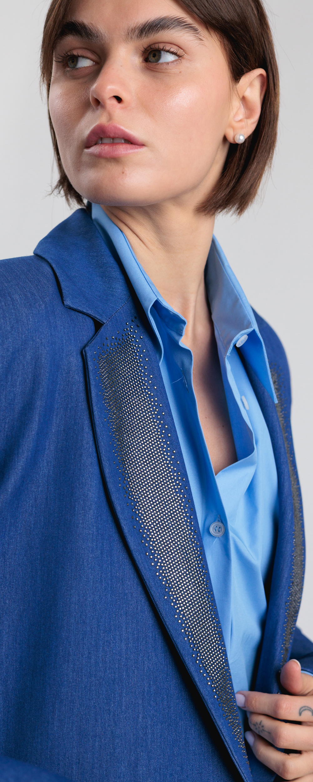 GIACCA MONOPETTO DENIM MEDIO SCURO, REVERE CON STRASS BLAZER 3S26 EXCLUSIVE