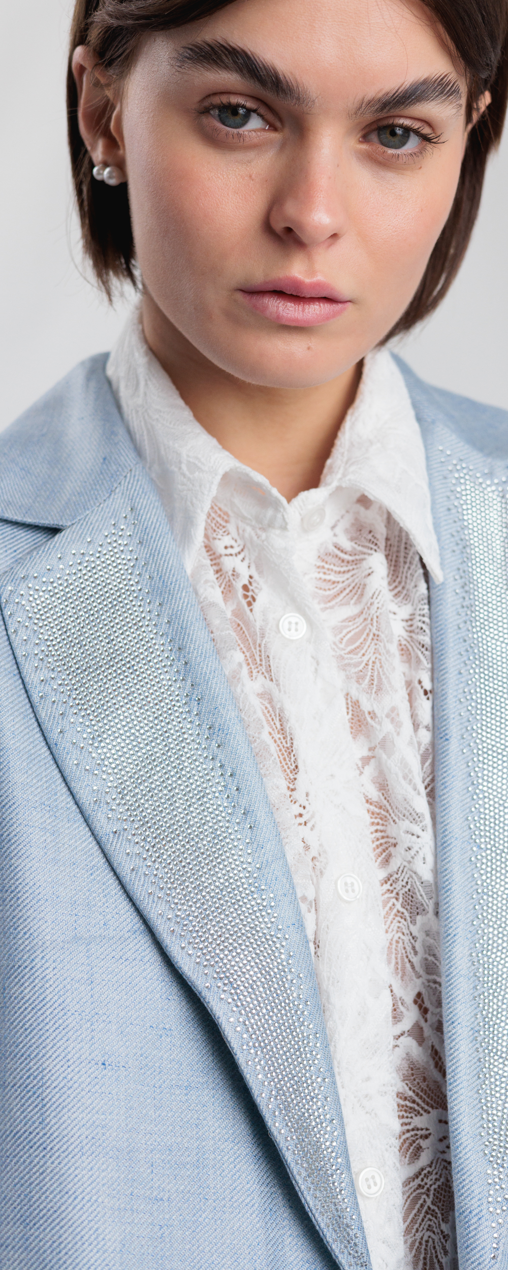 GIACCA MONOPETTO LINO AZZURRO/GRIGIO CHIARO, REVERE CON STRASS BLAZER 2S26 EXCLUSIVE