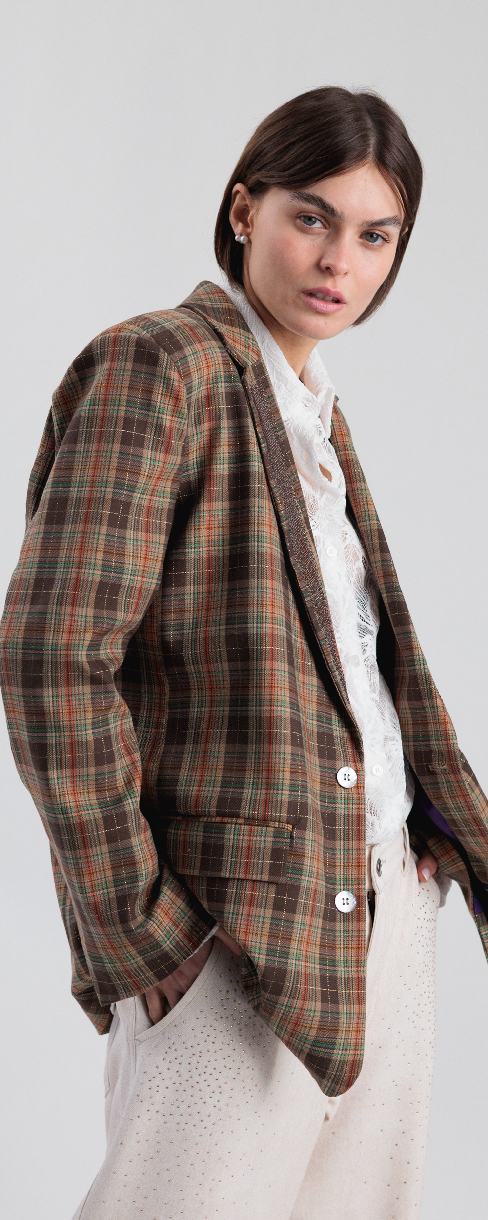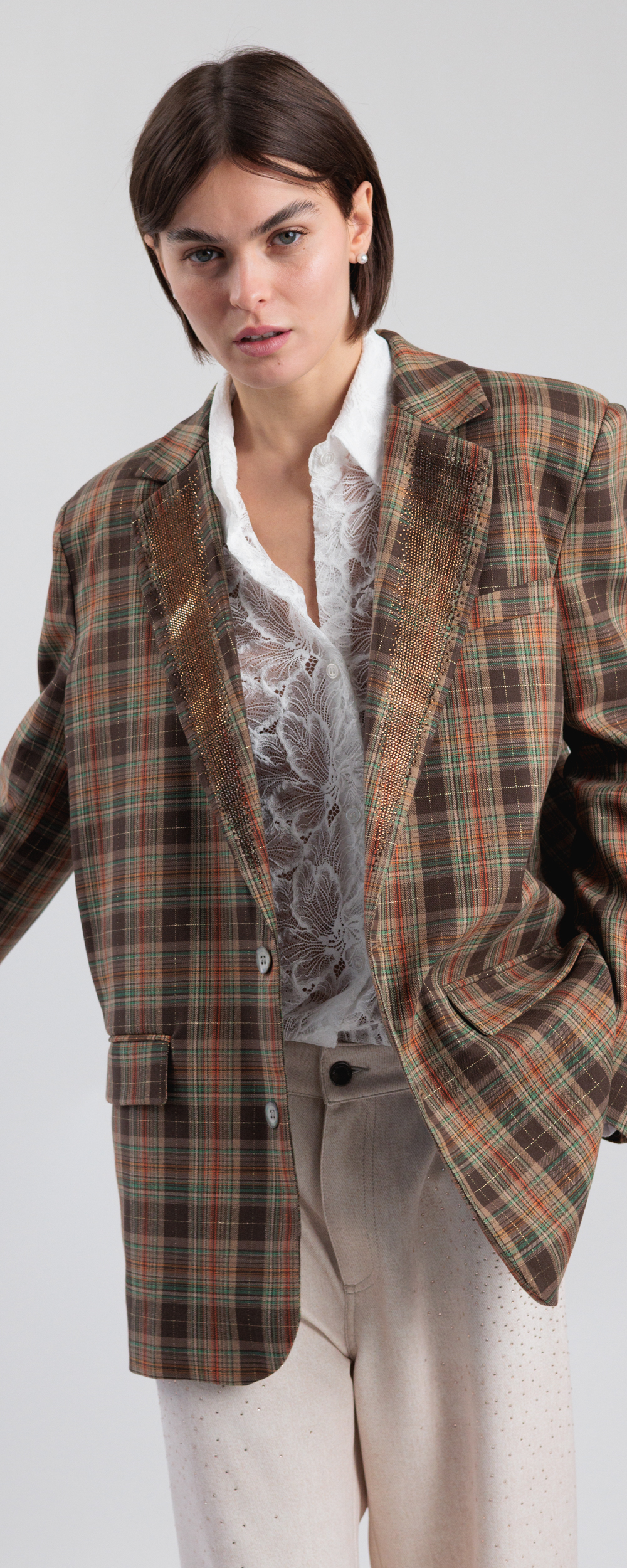 Blazer monopetto con chiusura 2 bottoni in madreperla. Revere a lancia e tasche con patta in vita e un taschino profilato sul petto. Foderata in raso. Vestibilità standard taglio oversize. Spalline interne imbottite.