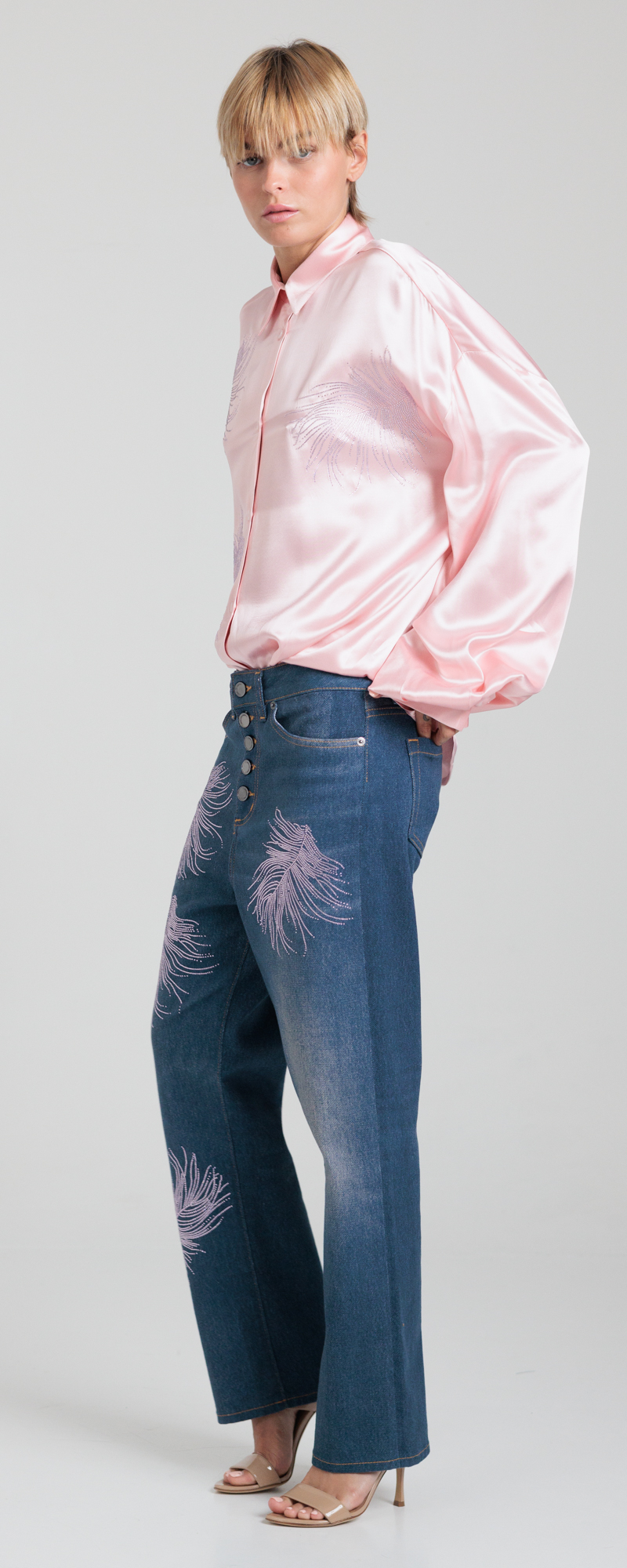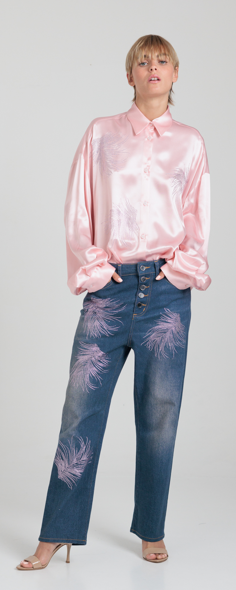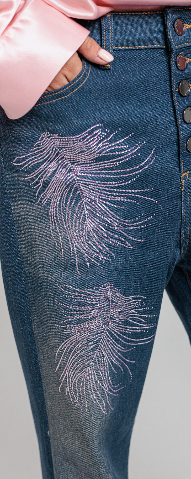 Applicazione di piume in strass di cristallo, color light rose, sul davanti.