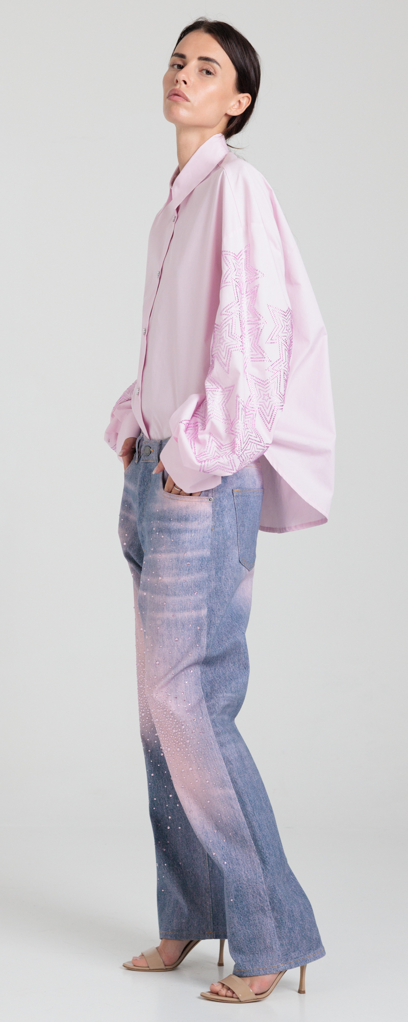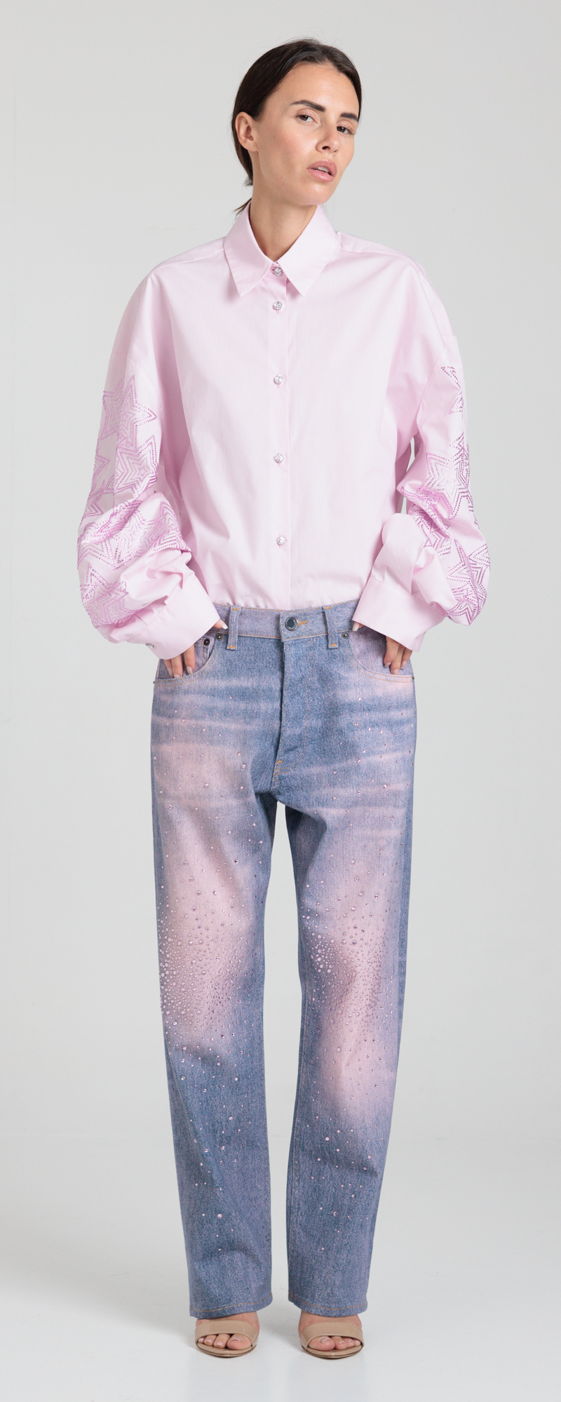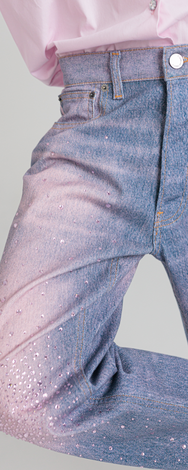 Applicazione strass in cristallo colore light rose sulla parte centrale del ginocchio a sfumare sopra e sotto in degrade’.