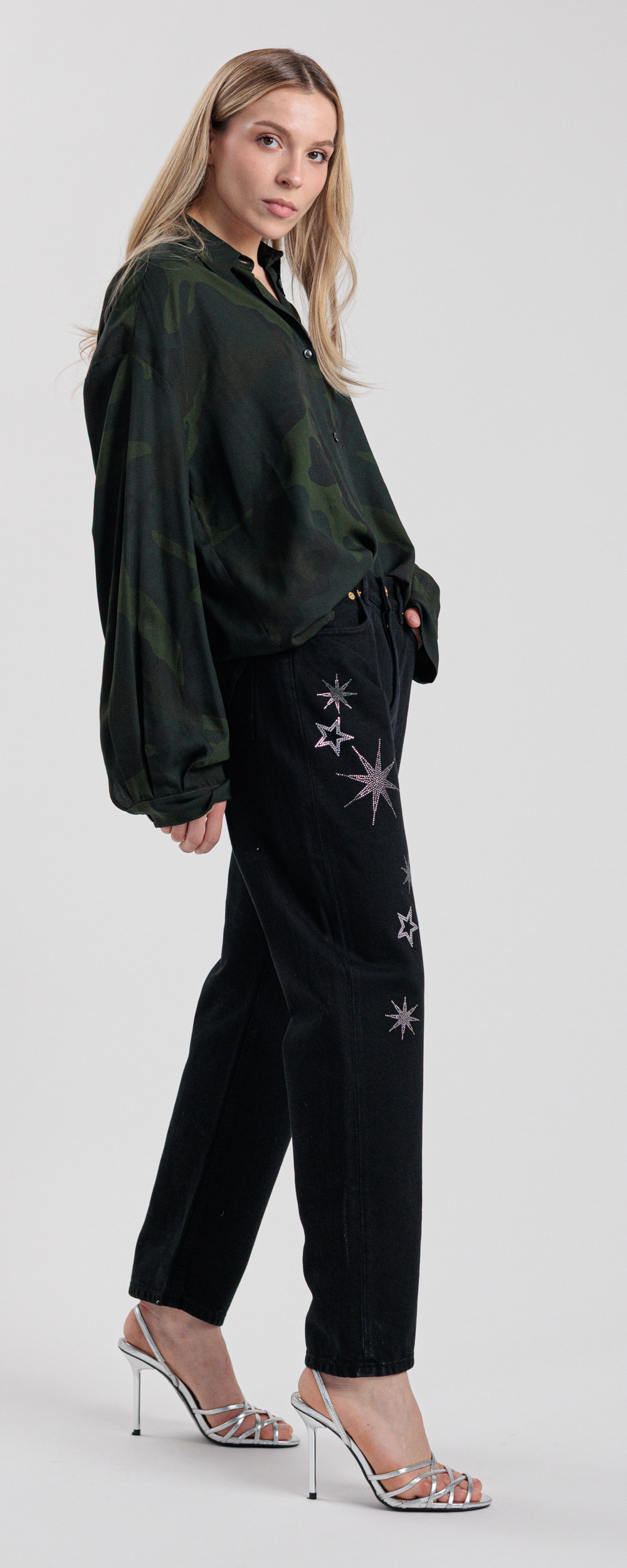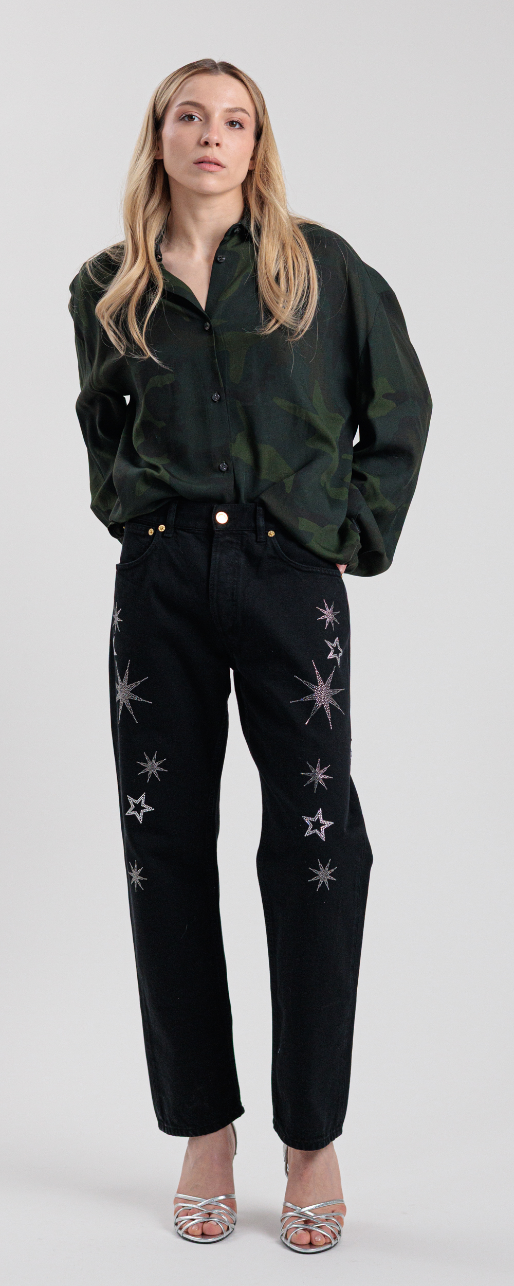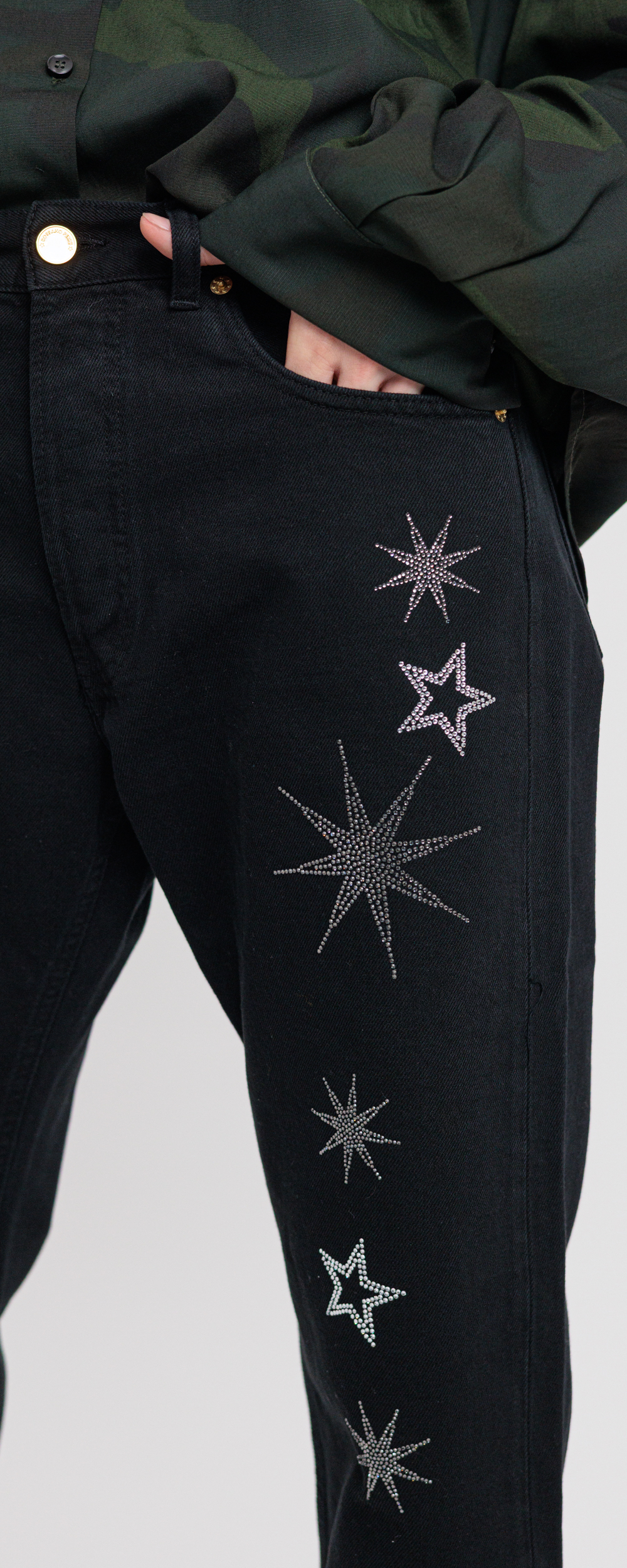 Applicazione di stelle in strass di cristallo color black diamond e crystal.