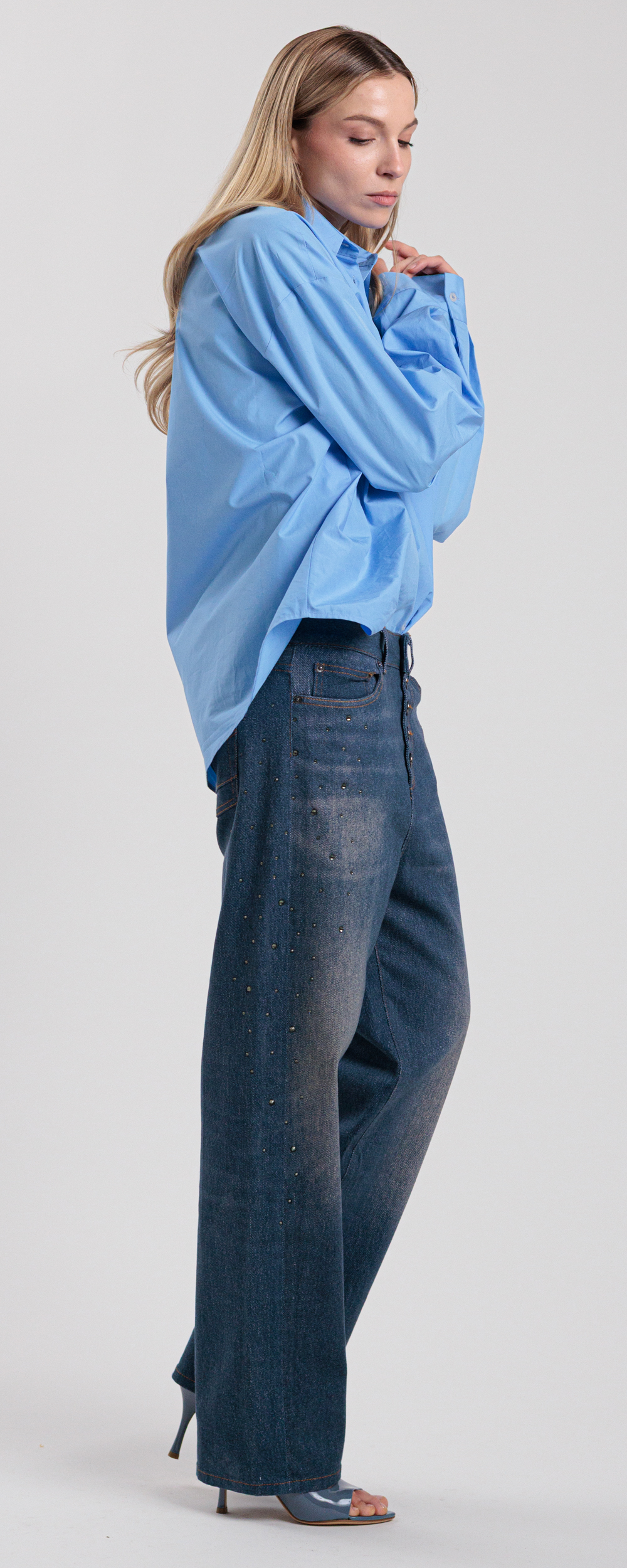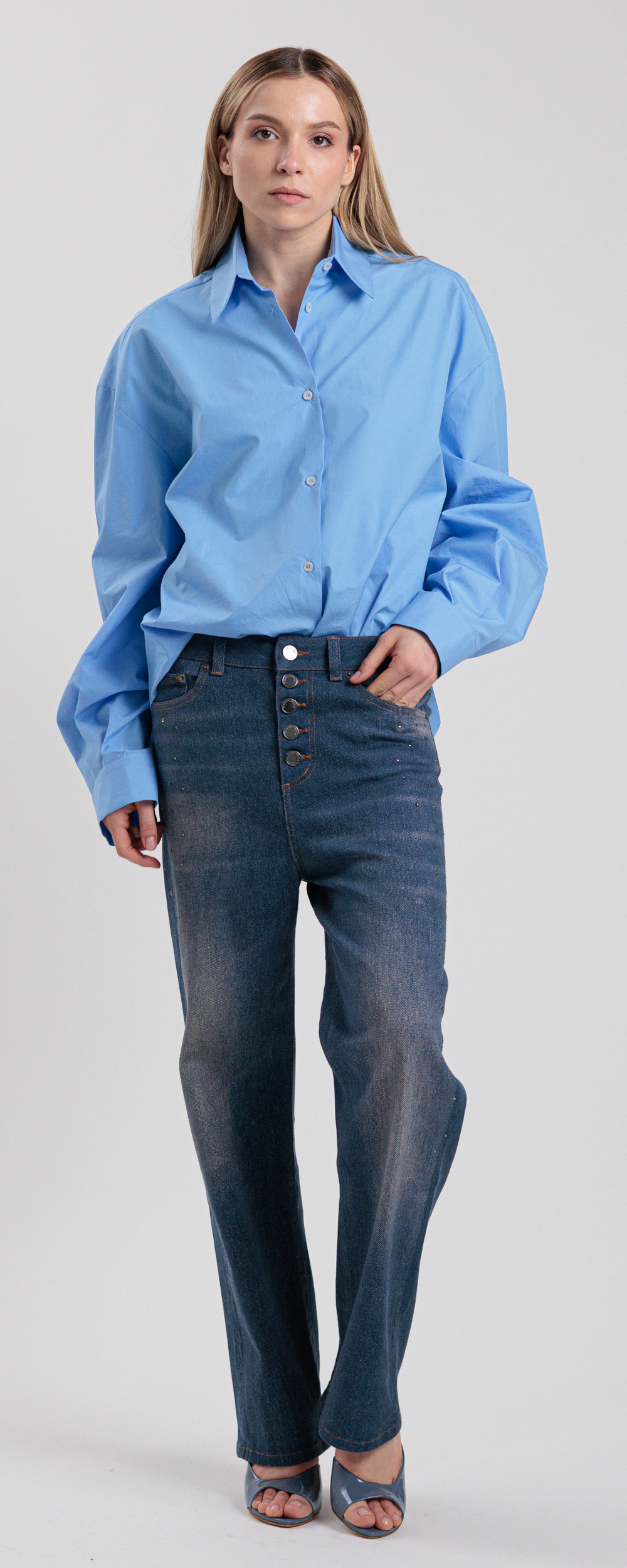 Jeans vestibilità morbida modello loose fit, lunghezza alla caviglia, cinque tasche, chiusura con bottoni sul davanti.