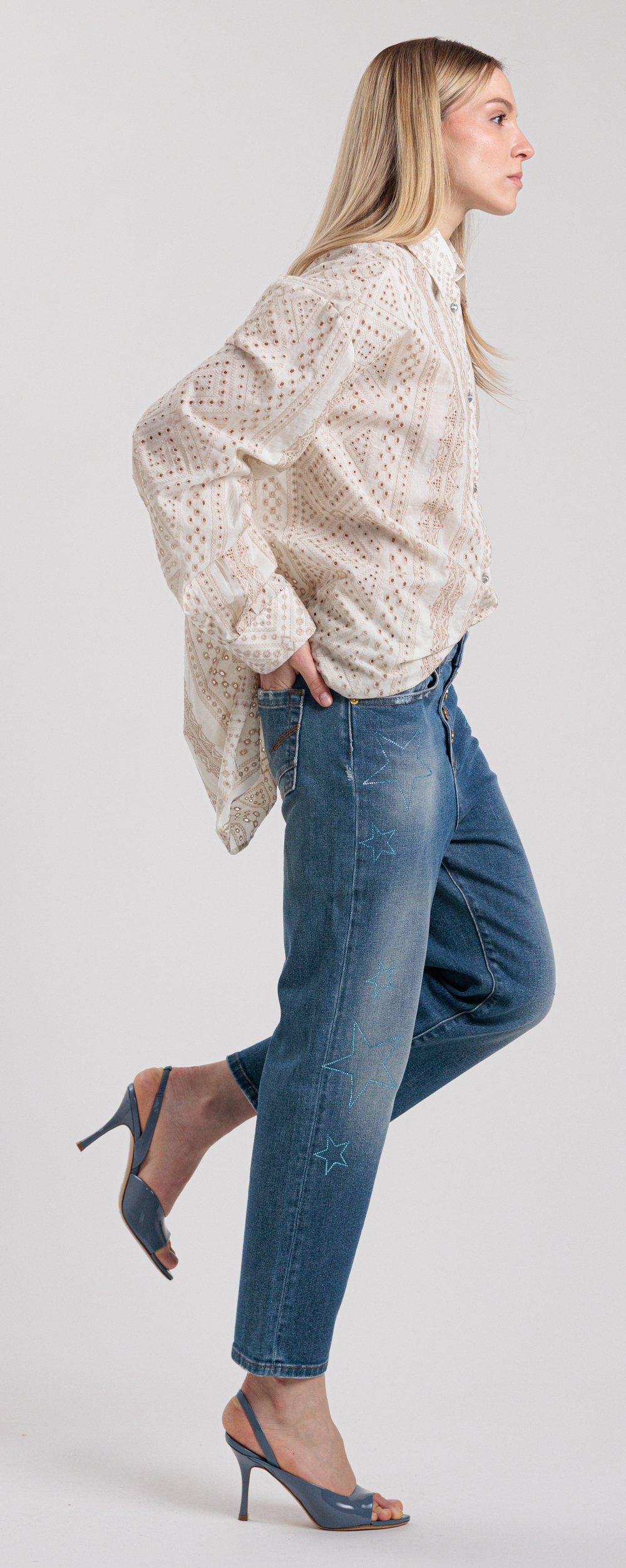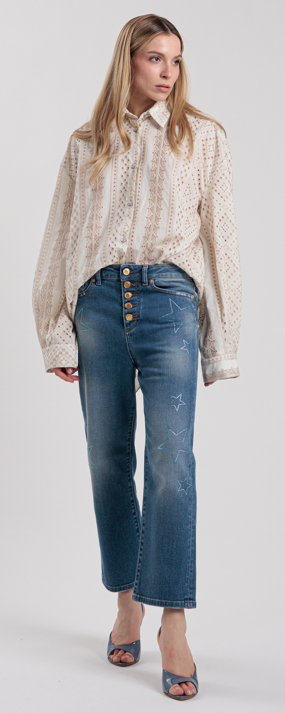 Jeans vestibilità morbida modello loose fit, lunghezza alla caviglia, cinque tasche, chiusura con bottoni sul davanti.