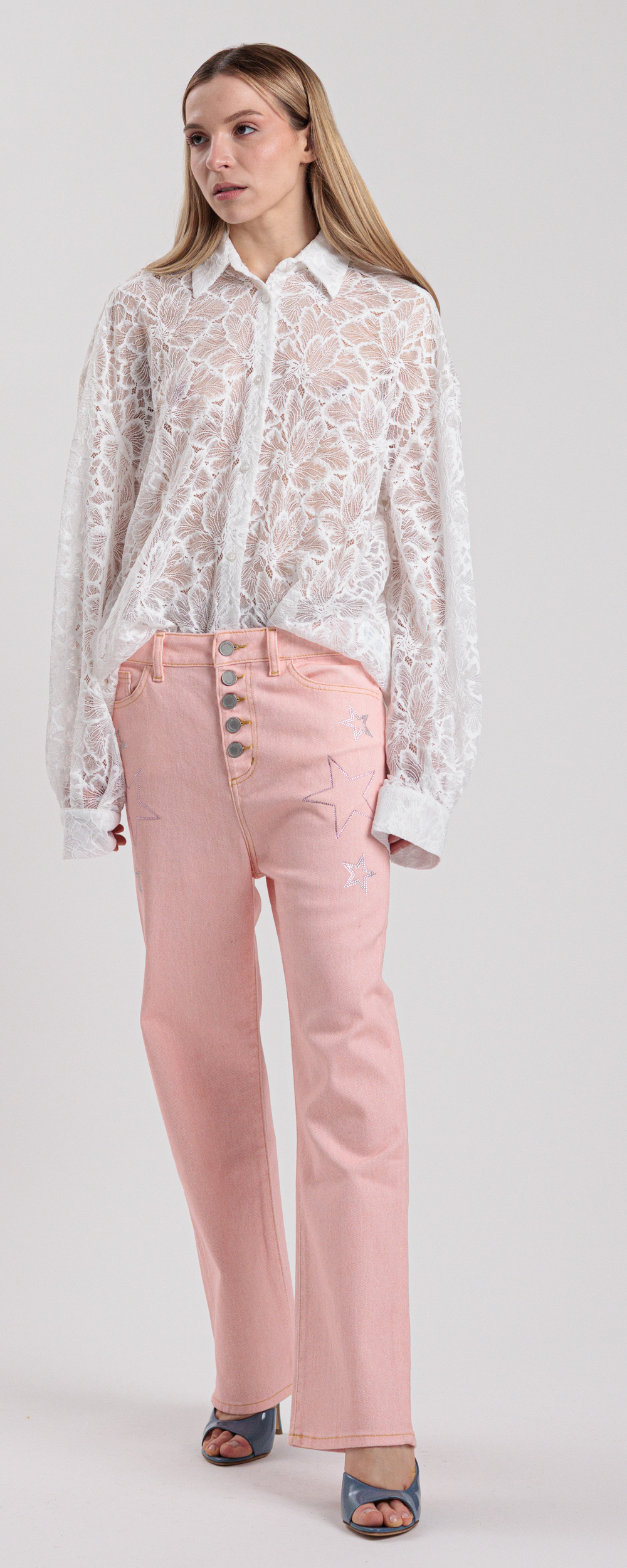 Jeans vestibilità morbida modello loose fit, lunghezza alla caviglia, cinque tasche, chiusura con bottoni sul davanti.