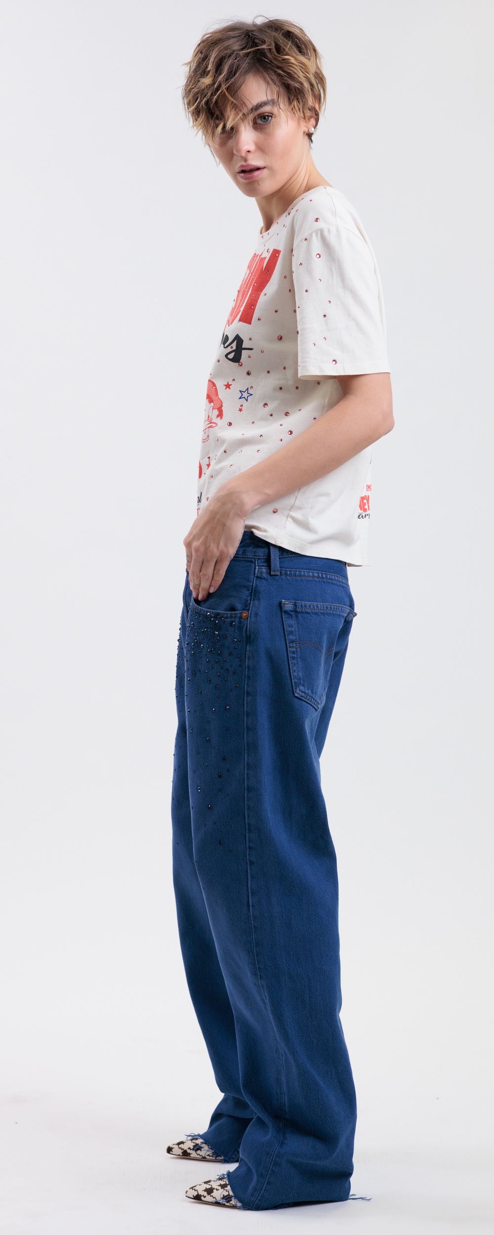 Vestibilità ampia, modello boyfriend da indossare morbido e a vita bassa.