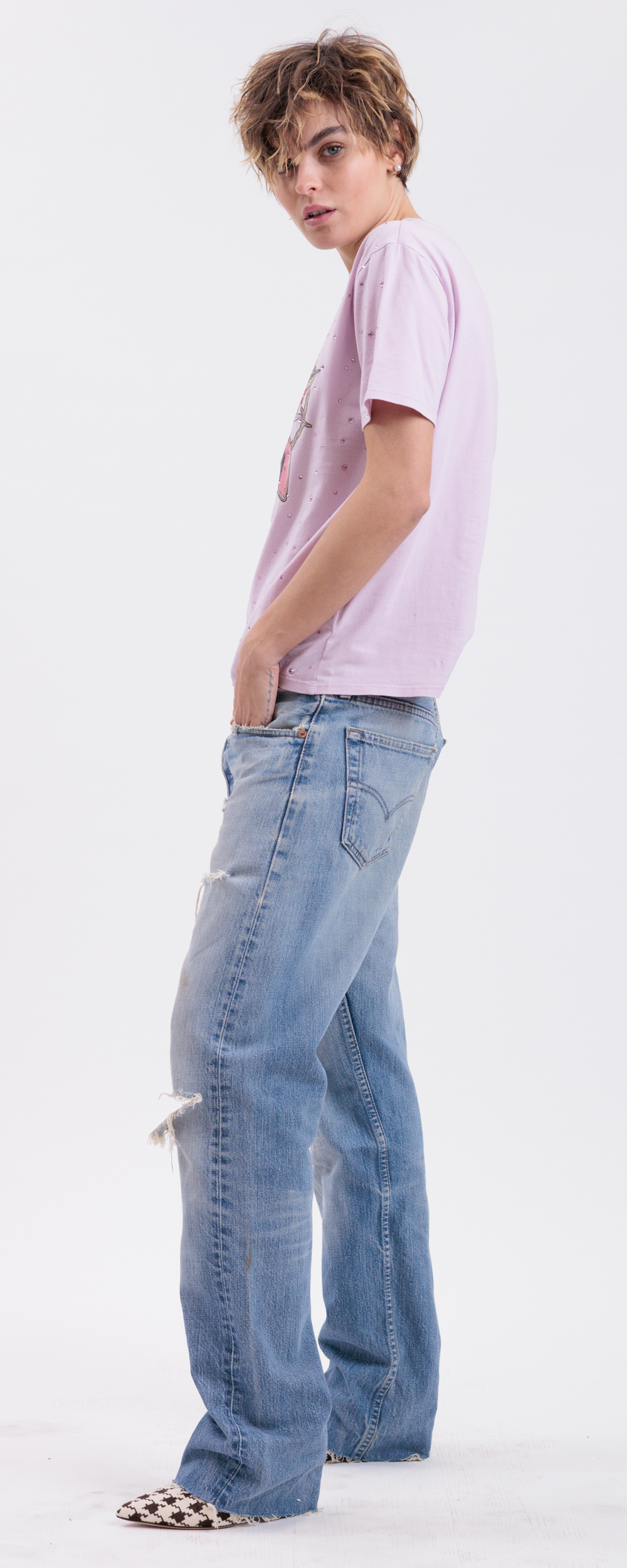 Vestibilità ampia, modello boyfriend da indossare morbido e a vita bassa.