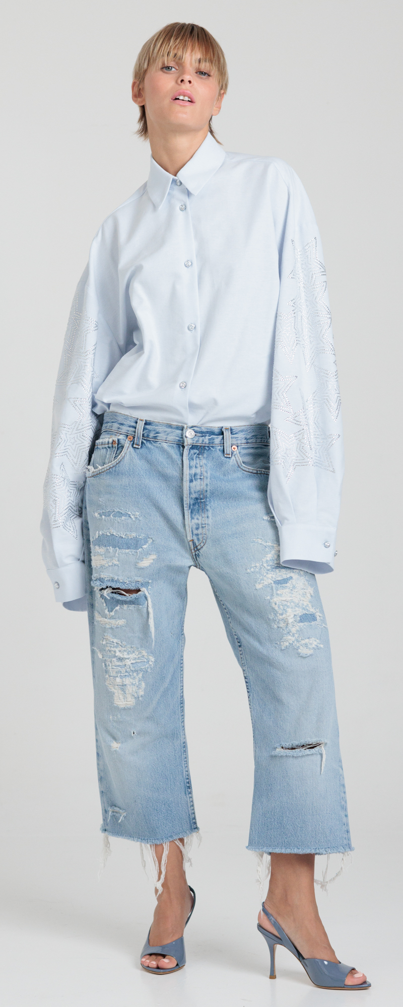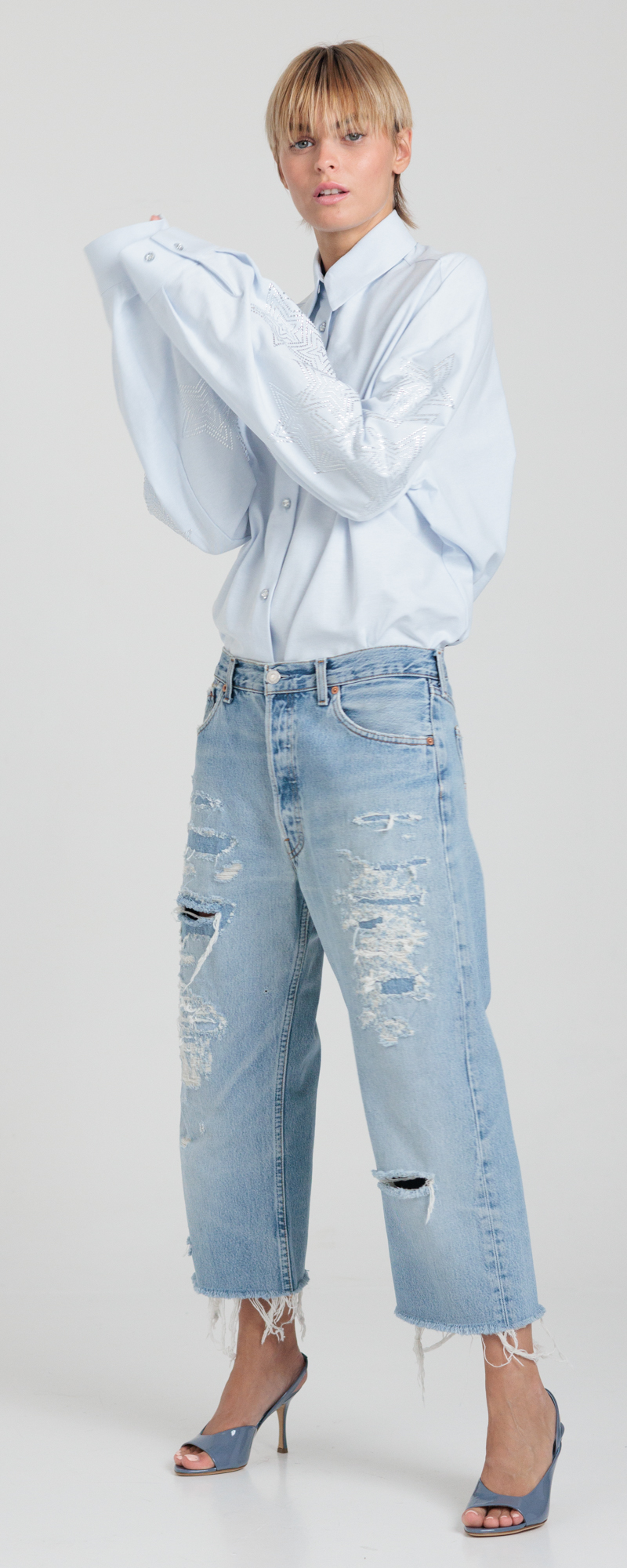 Drill di cotone blue denim con lavaggio destroyed e rammendi realizzati a mano.