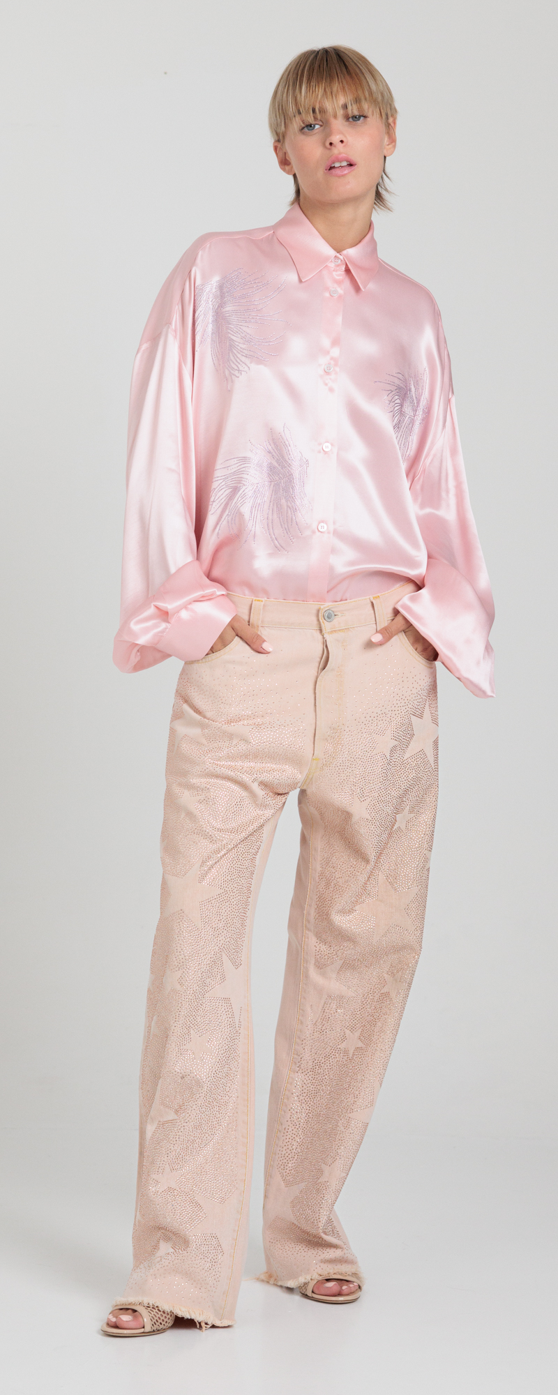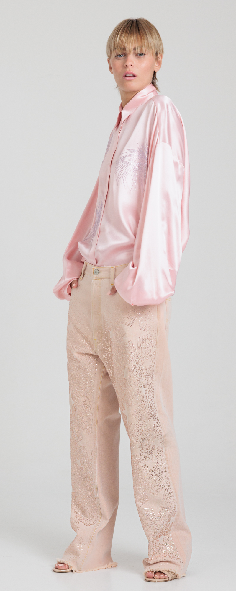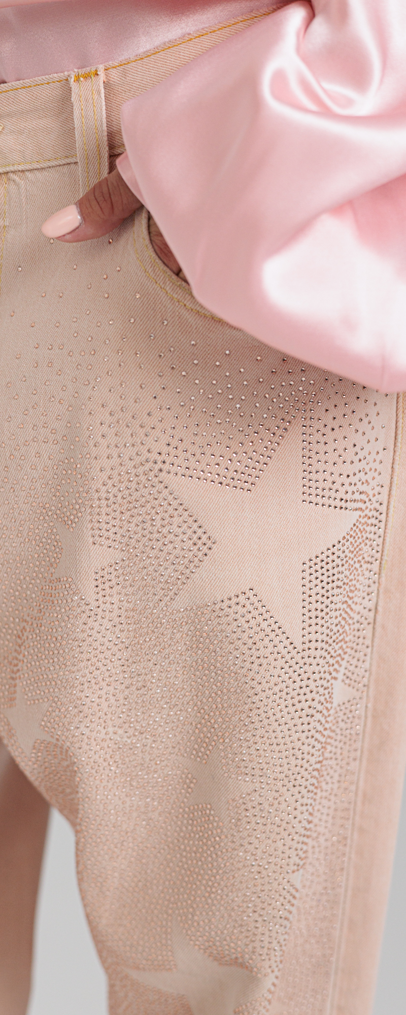 Drill di cotone color pesca. Applicazione sul davanti di strass in cristallo color silk con stelle in negativo.