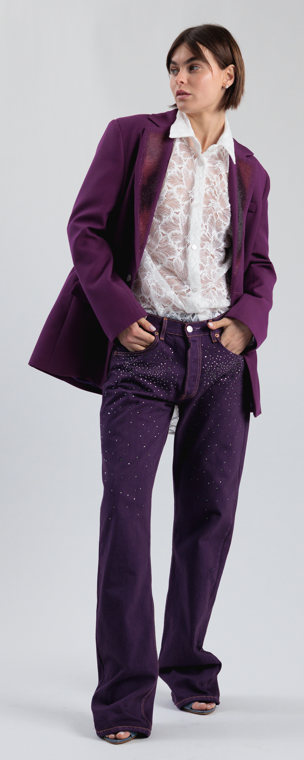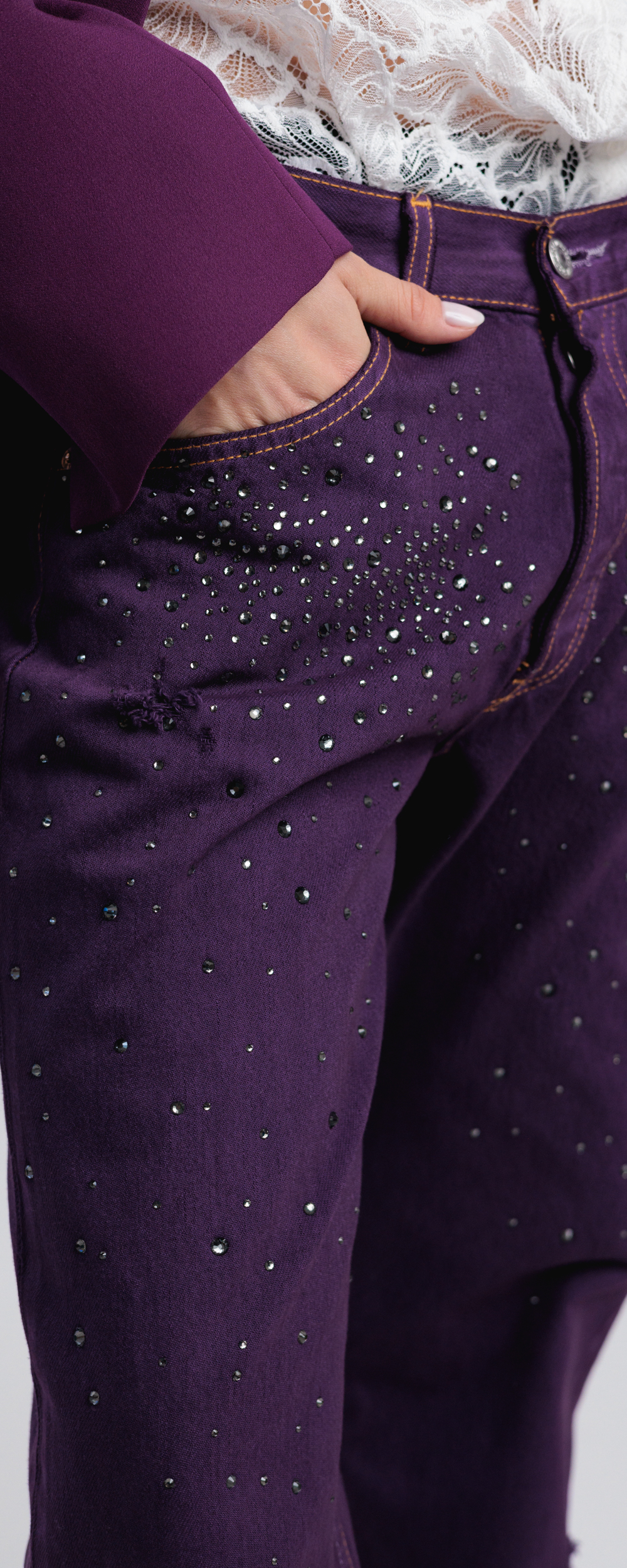 Base Denim vintage, stinto e sovratinto color porpora. Applicazione di strass in cristallo color black diamond.