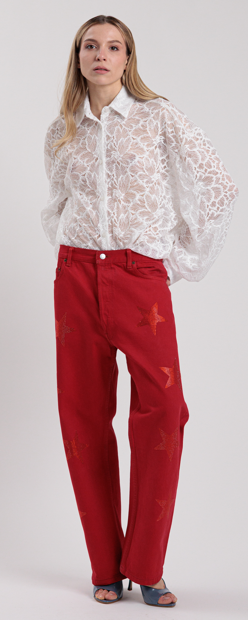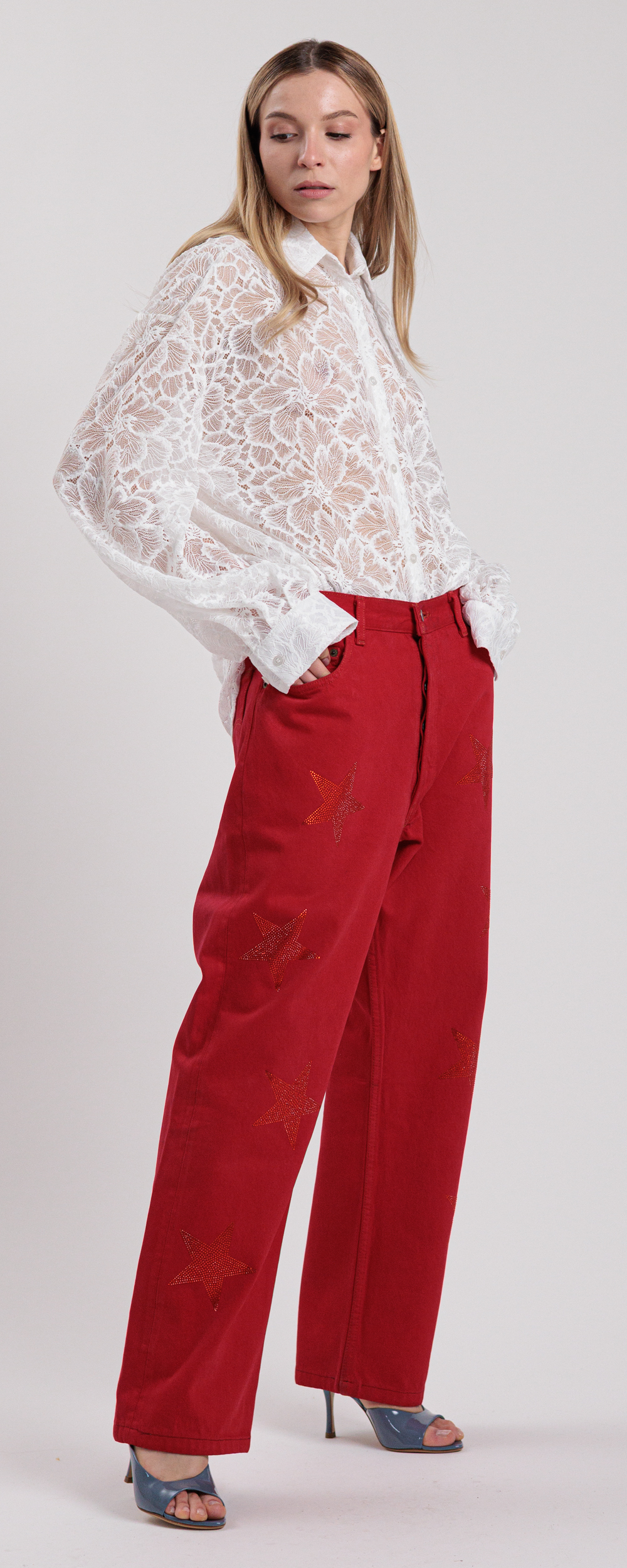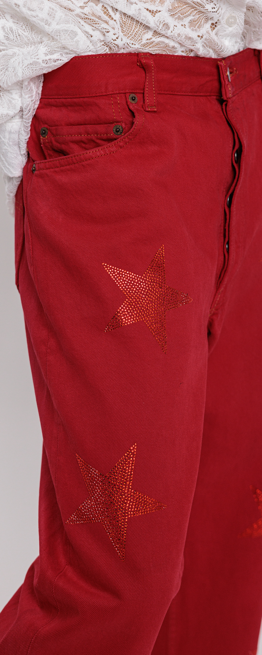 Jeans vintage, fondo taglio a vivo. Vestibilità ampia, modello boyfriend da indossare morbido e a vita bassa. Chiusura parzialmente nascosta con bottoni sul davanti.