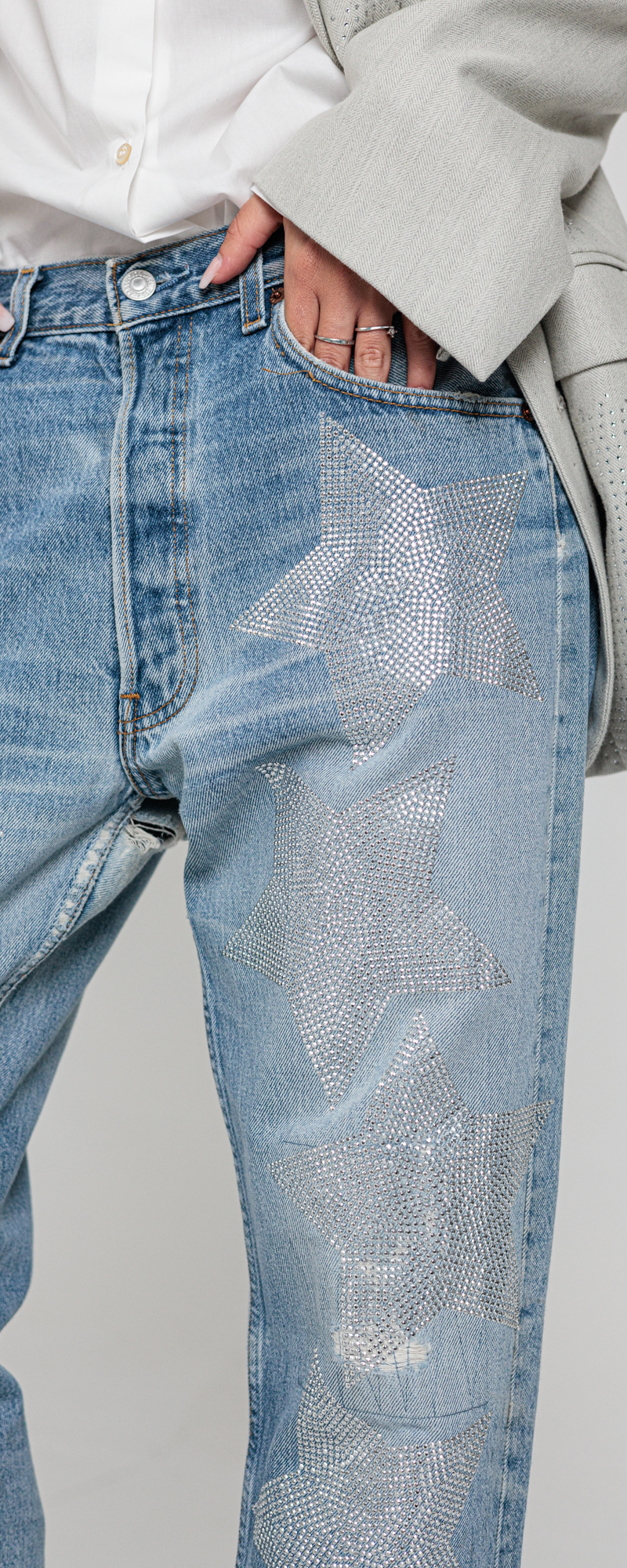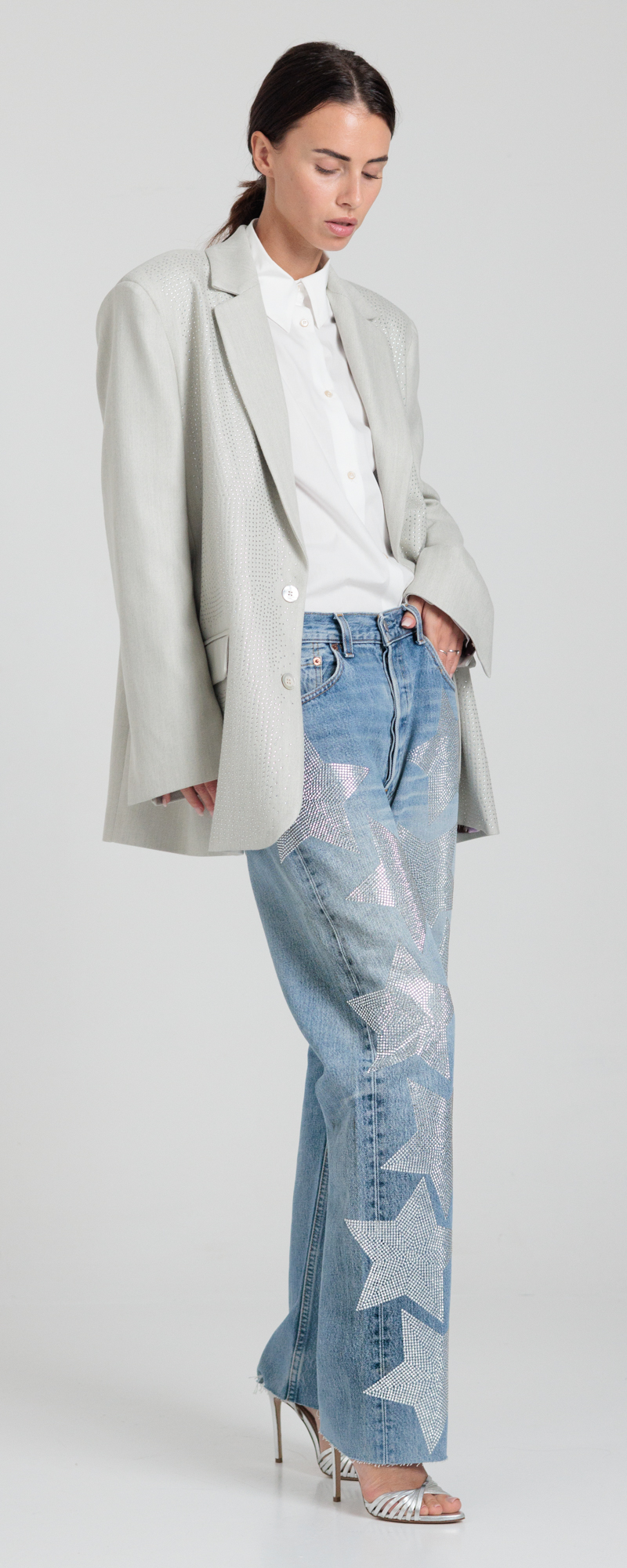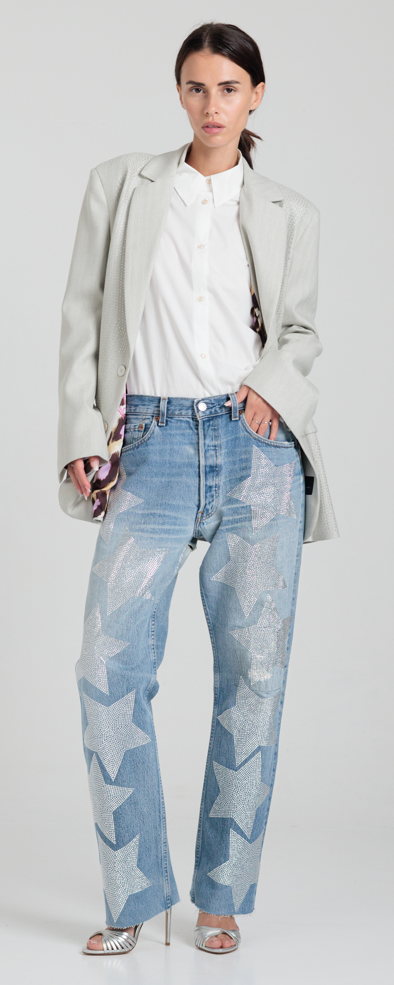 Drill di cotone blue denim. Applicazione macro stelle borchia color silver sulla parte davanti.