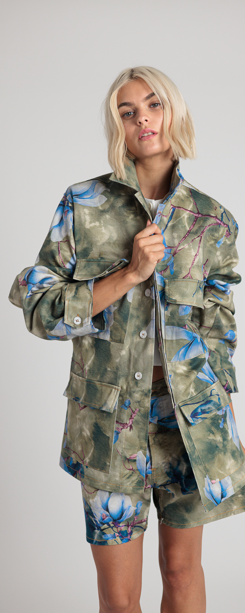 Stampa base color salvia effetto maltintura e stampa fiore magnolia dai toni dell’azzurro cielo.