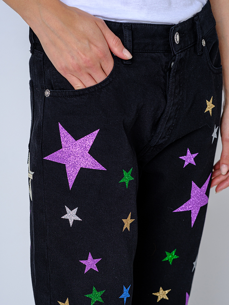 Tinto nero, stelle stampate glitter oro giallo, glitter viola, glitter azzurro, glitter argento, glitter verde.