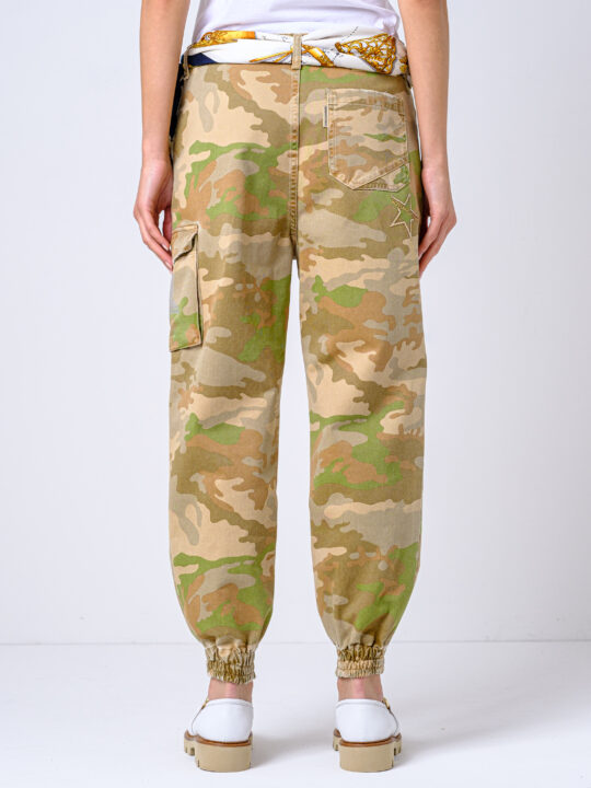 Cinque tasche boyfriend fit, vita regolare, bottoneria gioiello. Drill di cotone. Logo Rossano Perini. Made in Italy.