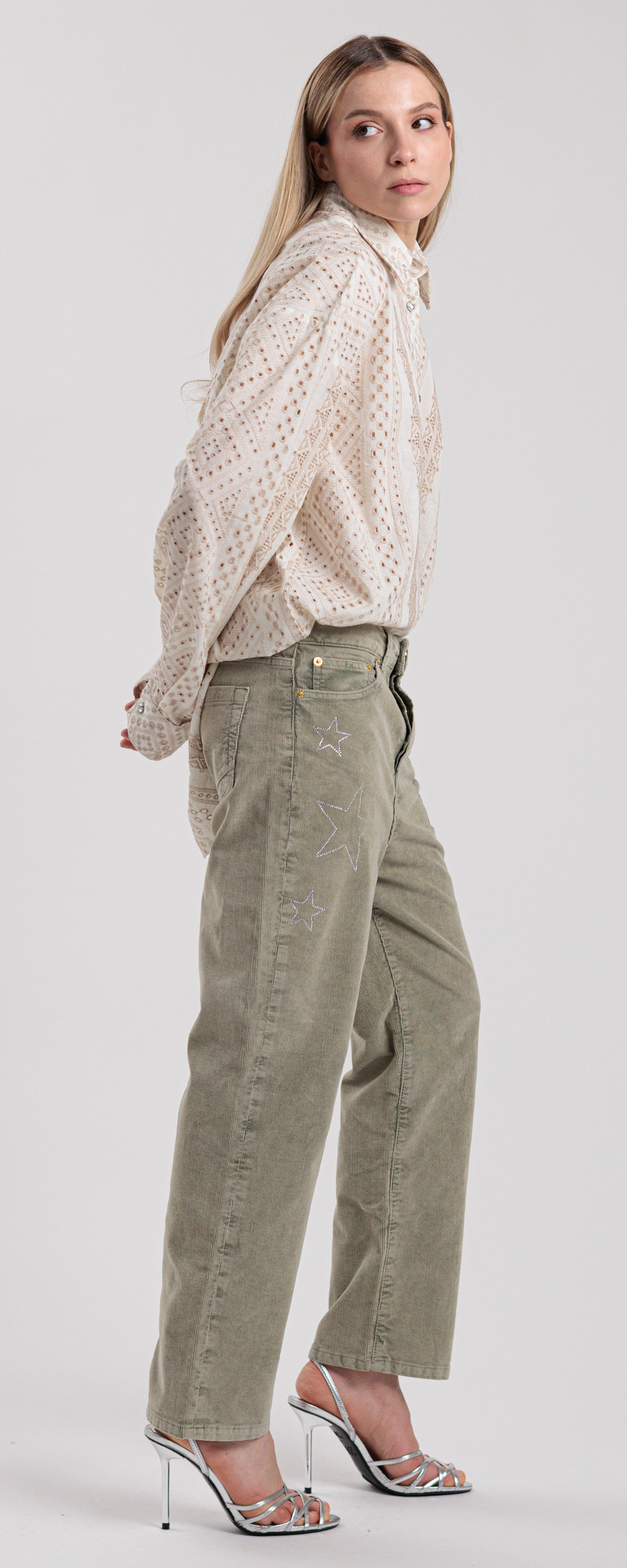 Pantalone cinque tasche loose fit, vita regolare e lunghezza alla caviglia. Chiusura parzialmente nascosta con bottoni sul davanti.