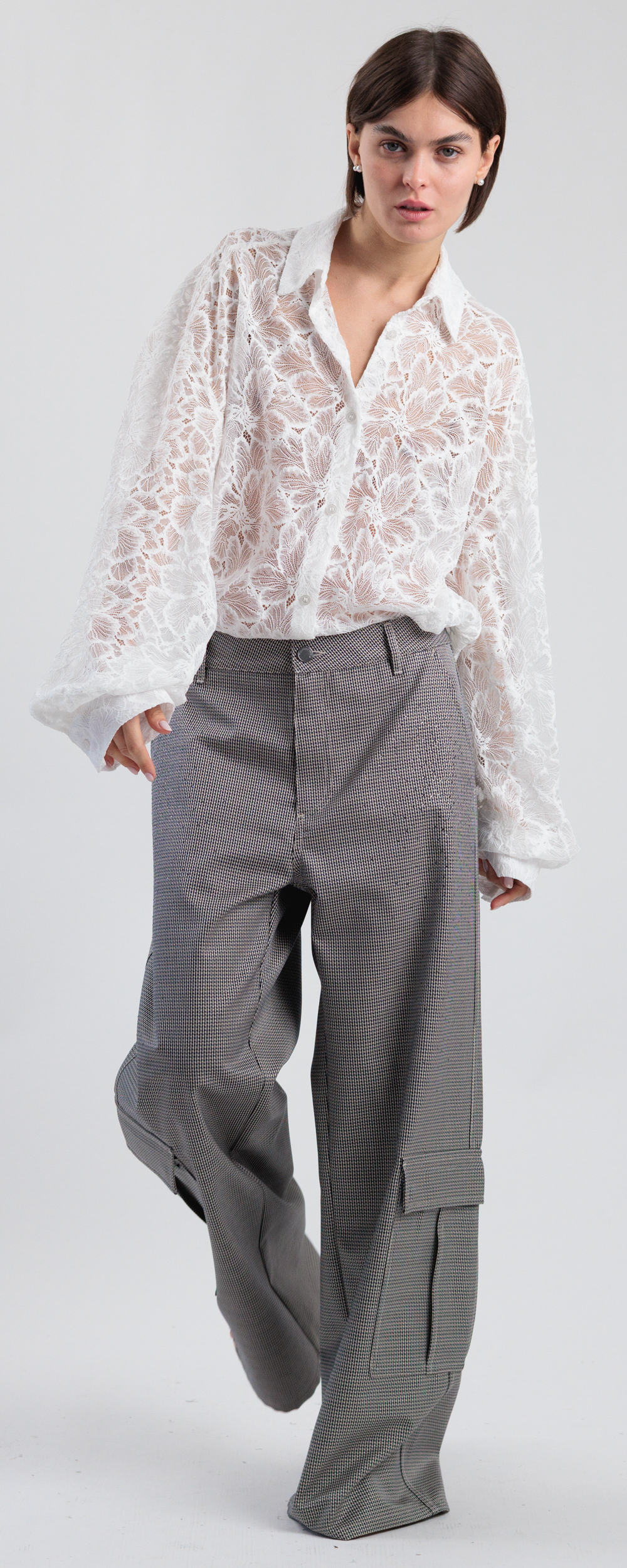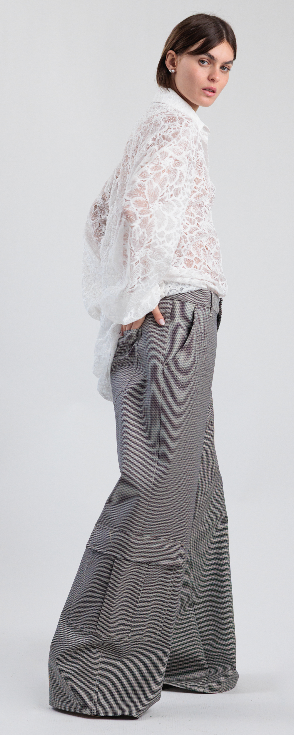 Pantalone combat gamba larga, con due tasconi verso il fondo. Vestibilità ampia, da indossare morbido e a vita bassa. Chiusura con bottone e zip nascosta sul davanti. Tessuto di peso medio.