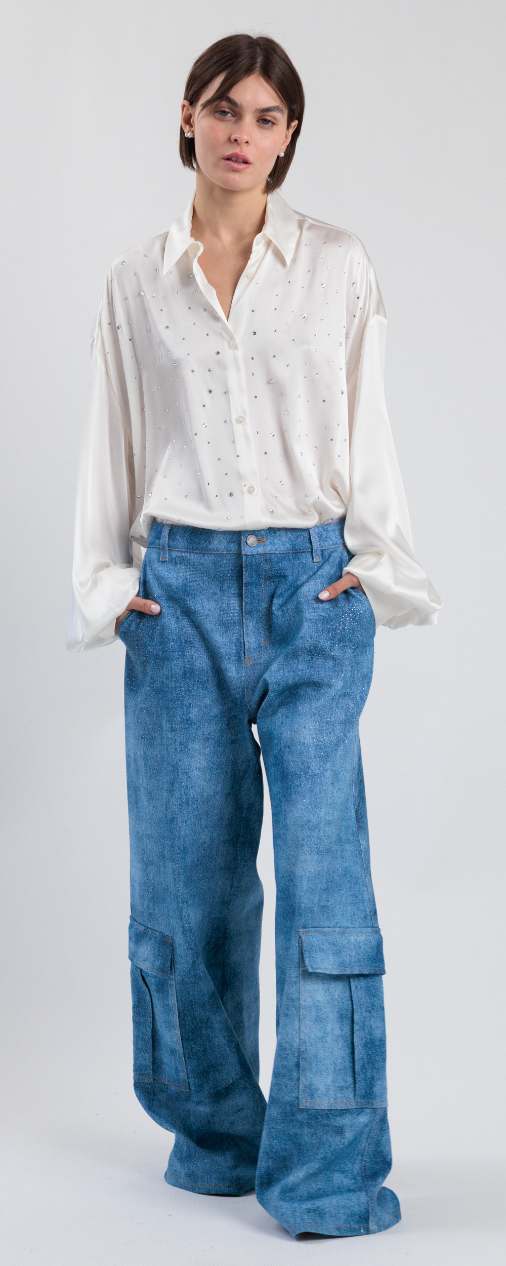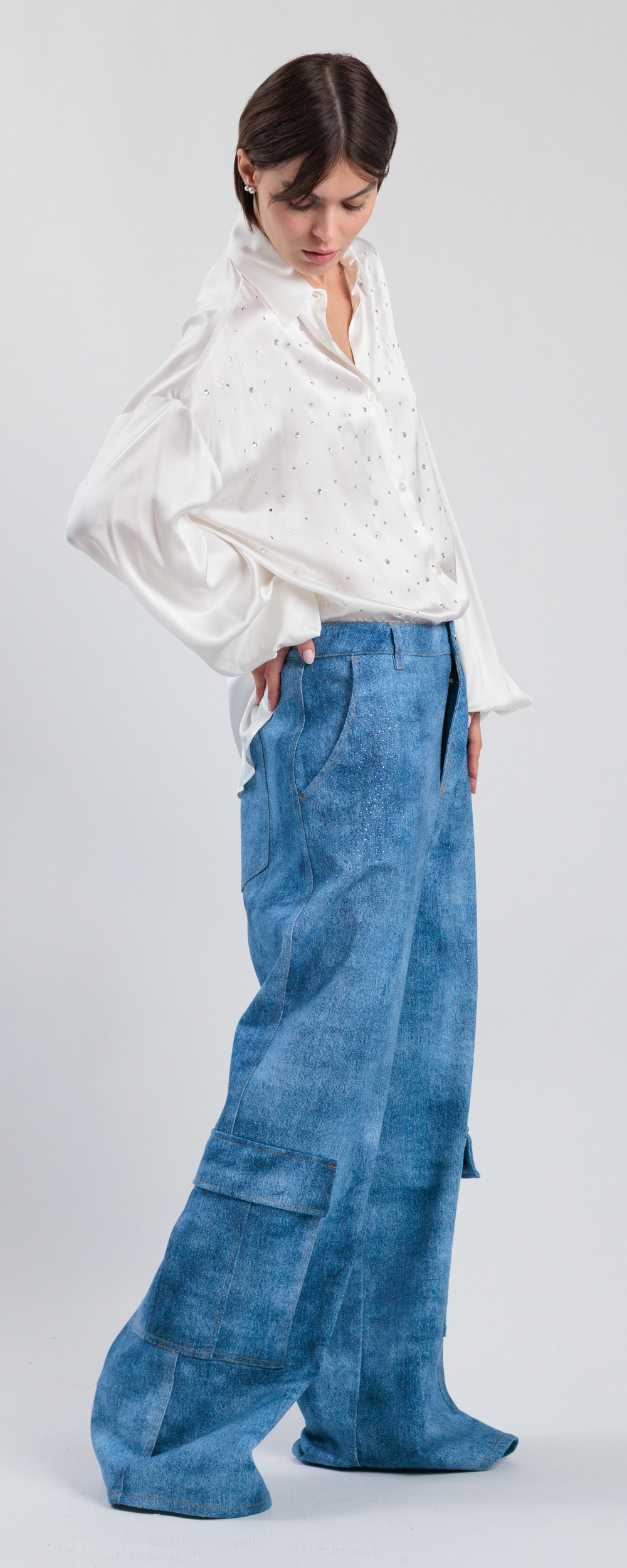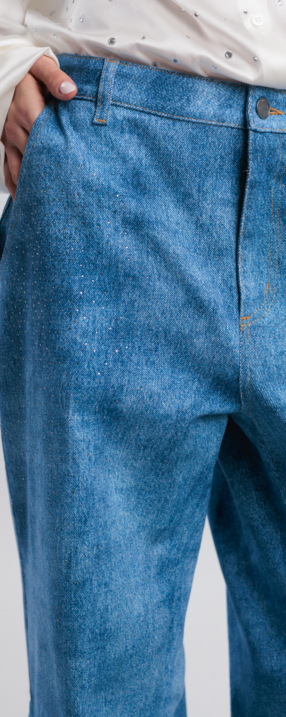 Stampa effetto denim medio scuro maltinto. Applicazione di micro strass in cristallo color black diamond.