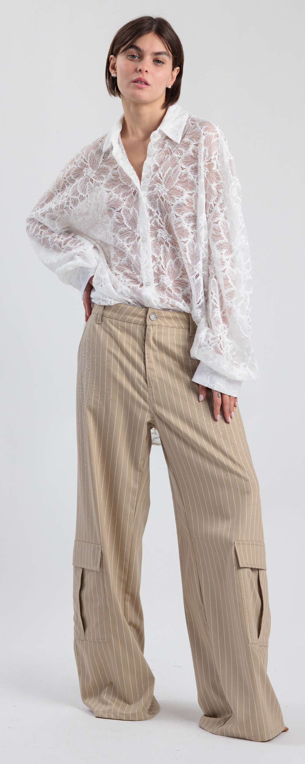 Pantalone combat gamba larga, con due tasconi verso il fondo. Vestibilità ampia, da indossare morbido e a vita bassa. Chiusura con bottone e zip nascosta sul davanti. Tessuto di peso medio.