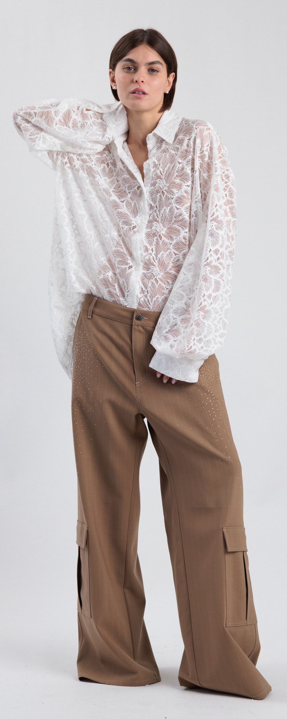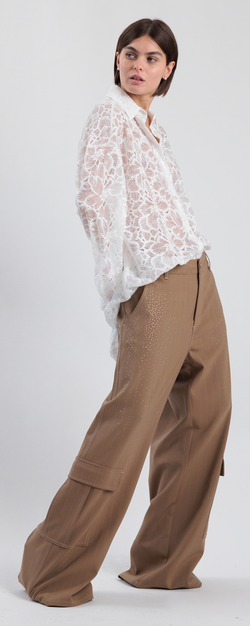 Pantalone combat gamba larga, con due tasconi verso il fondo. Vestibilità ampia, da indossare morbido e a vita bassa. Chiusura con bottone e zip nascosta sul davanti. Tessuto di peso medio.
