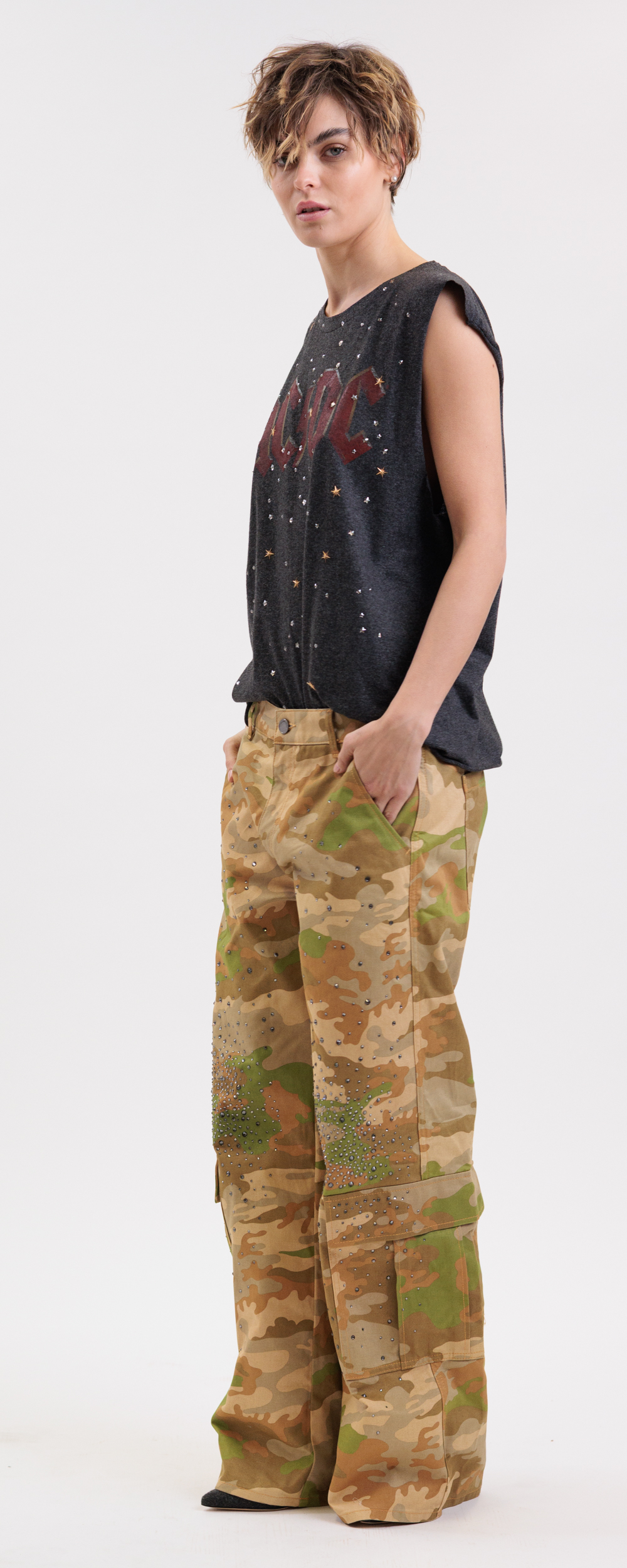 PANTALONE PALAZZO CON TASCONI MIMETICO CON STRASS COMBAT 15 EXCLUSIVE
