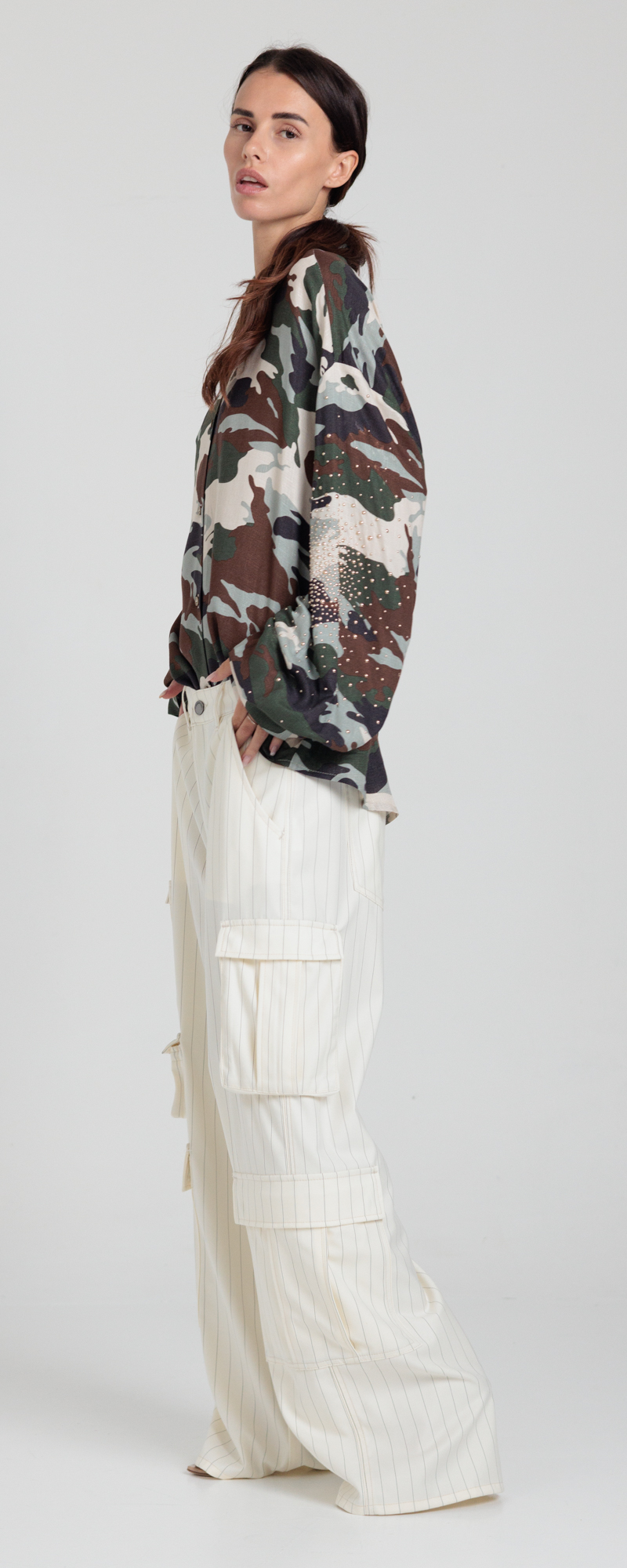 Pantalone combat gamba larga, con 5 tasconi dall’alto e verso il fondo.