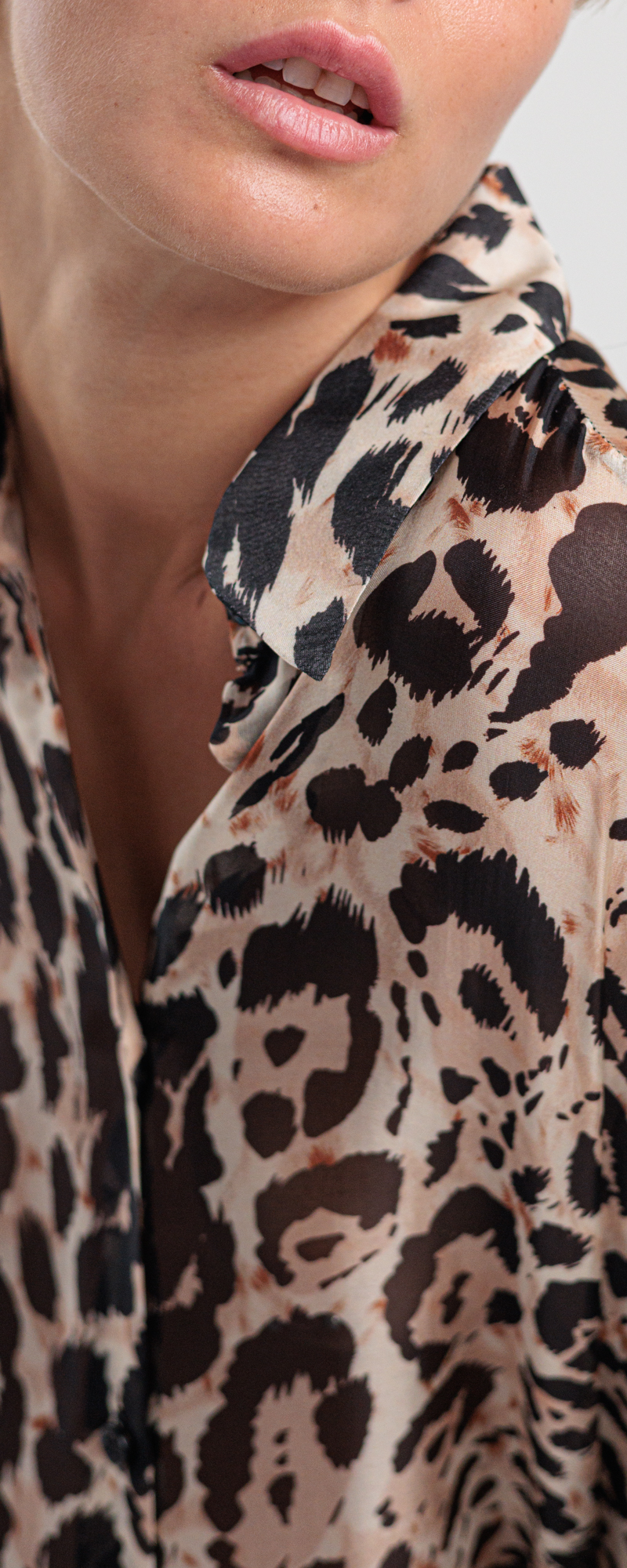 Tessuto chiffon seta e viscosa stampa leopardata color sabbia, beige, cioccolato e nero.