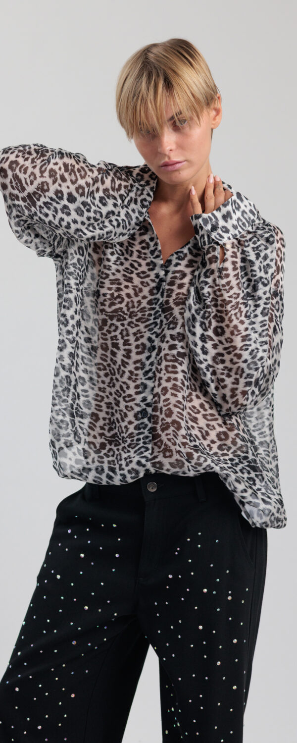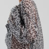 Tessuto chiffon seta e viscosa stampa leopardata color nero, grigio e panna.