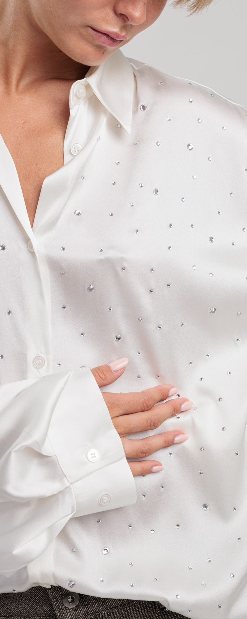 Tessuto seta color avorio. Applicazione strass in cristallo color crystal.