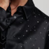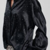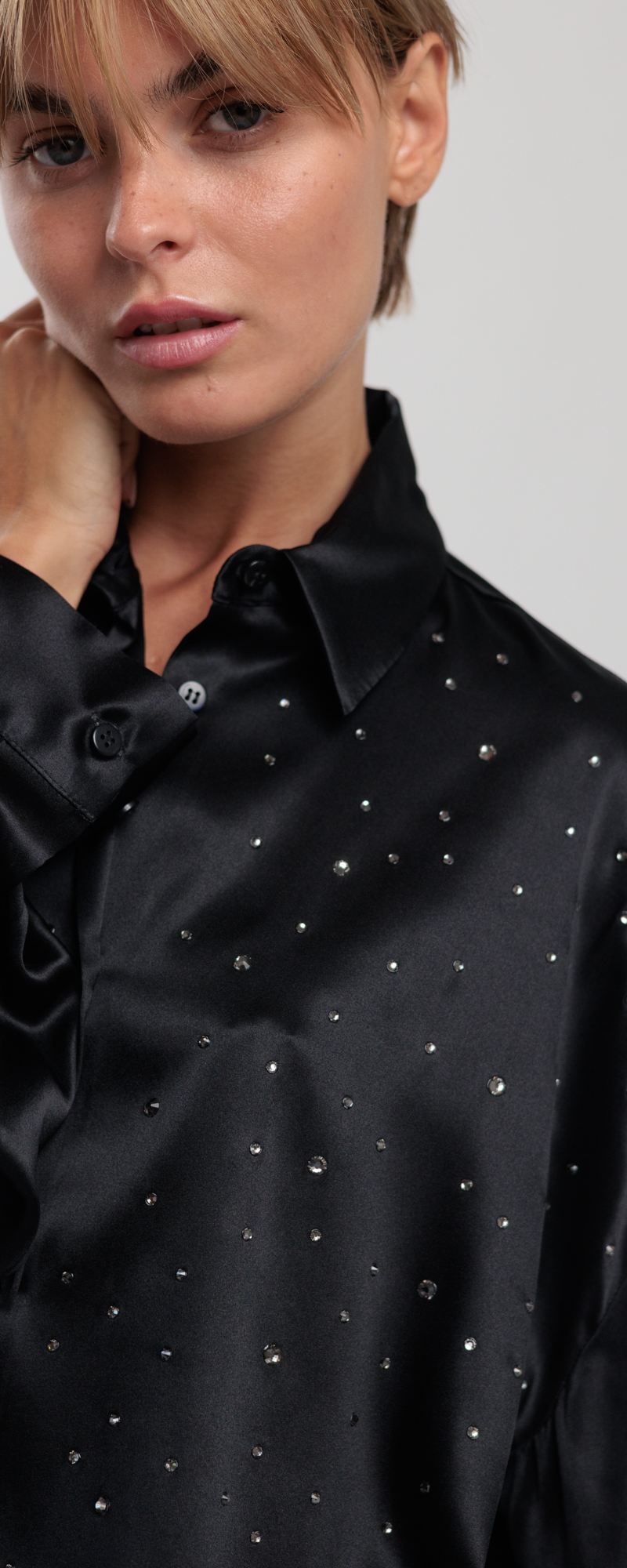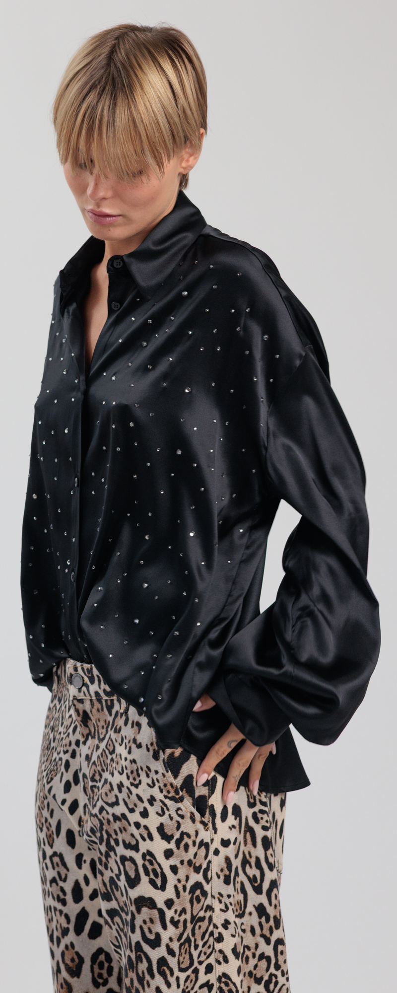 Tessuto seta color nero. Applicazione strass in cristallo color black diamond.