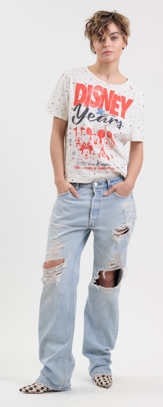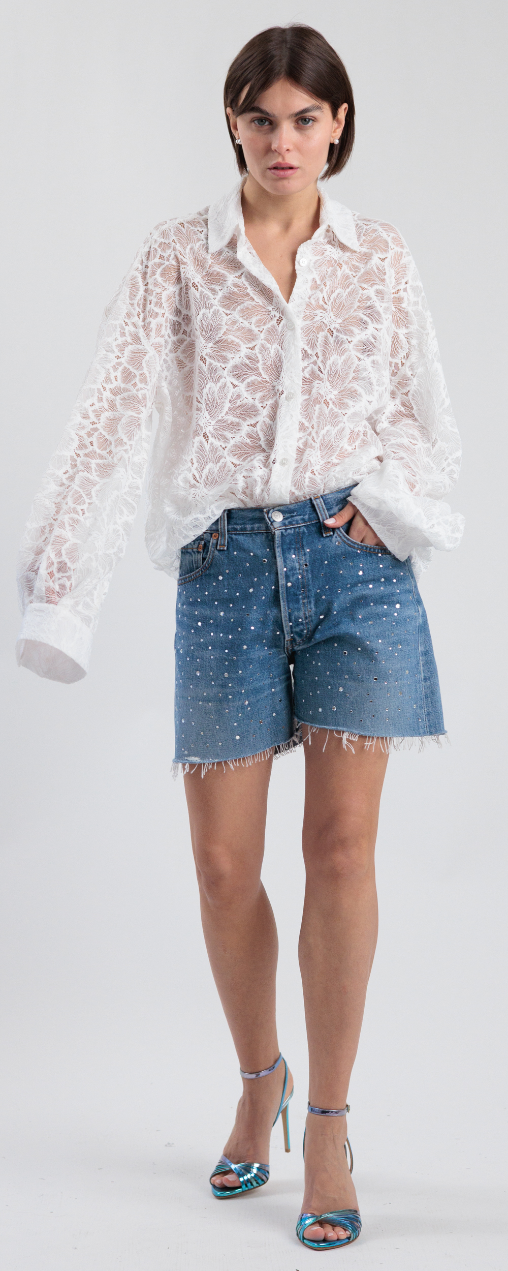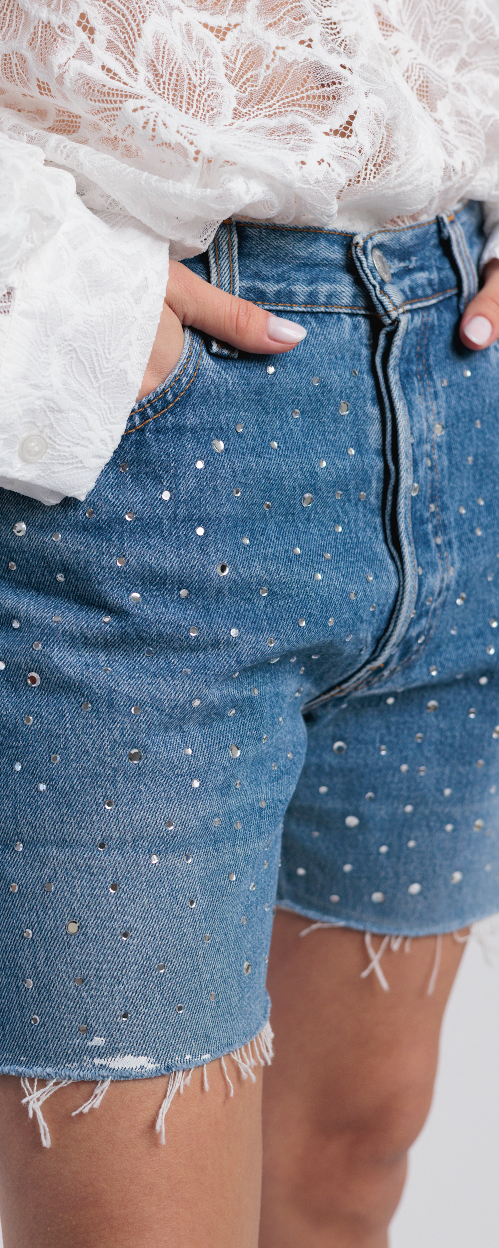 Base Denim vintage. Applicazione di strass in cristallo sparsi sul davanti color crystal.