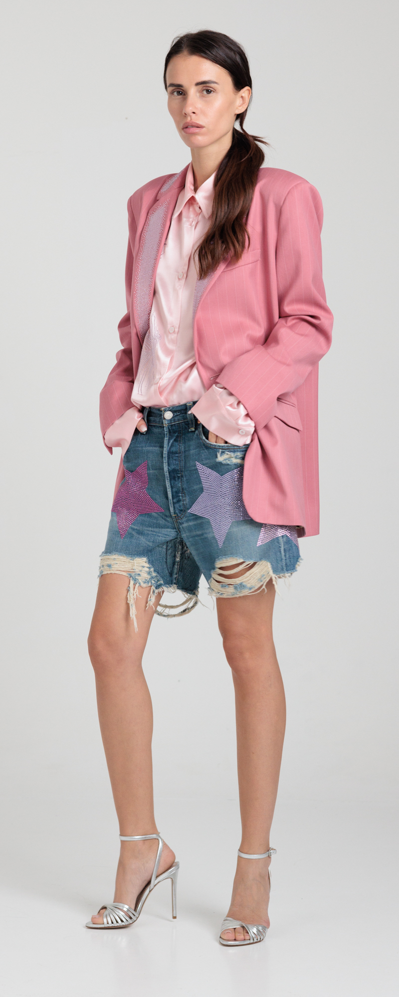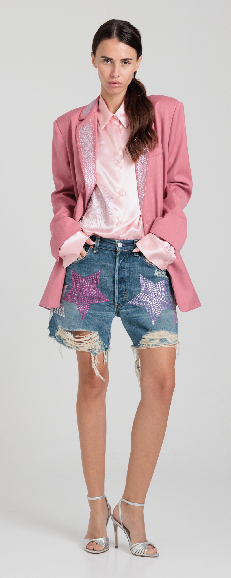 Applicazione macro stelle in strass di cristallo color fuchsia, crystal, light rose e violet, sul davanti.