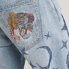 Applicazione di strass lune color blu e tigre su tasca posteriore.