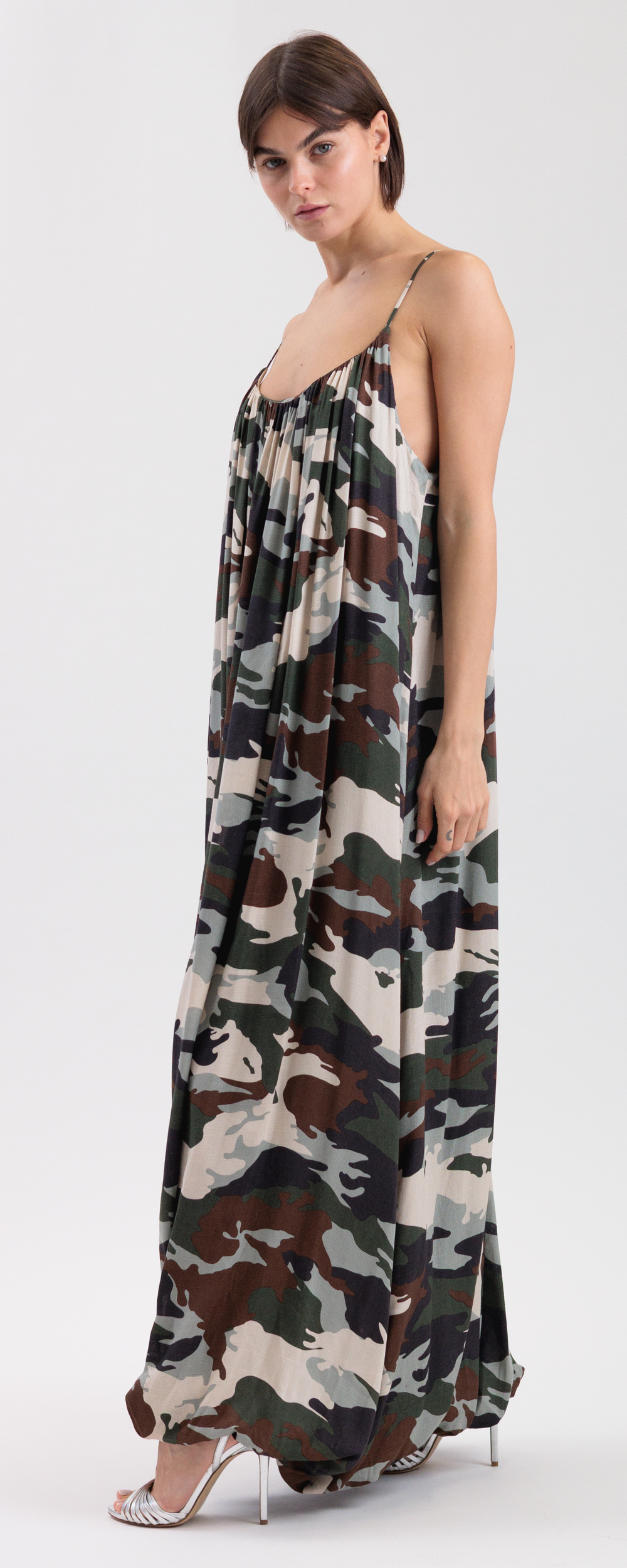 Abito maxi con arricciature, spalline sottili e fodera interna. Vestibilità standard, taglio ampio.