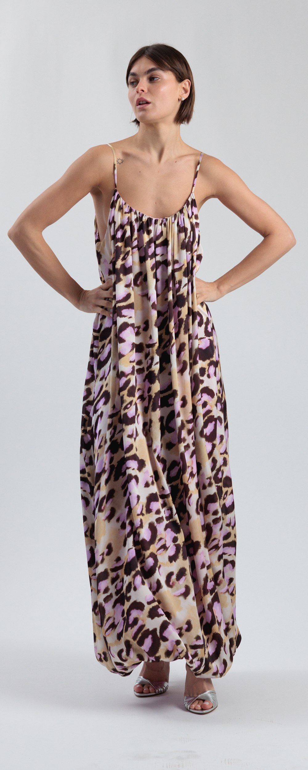 Abito maxi con arricciature, spalline sottili e fodera interna. Vestibilità standard, taglio ampio.